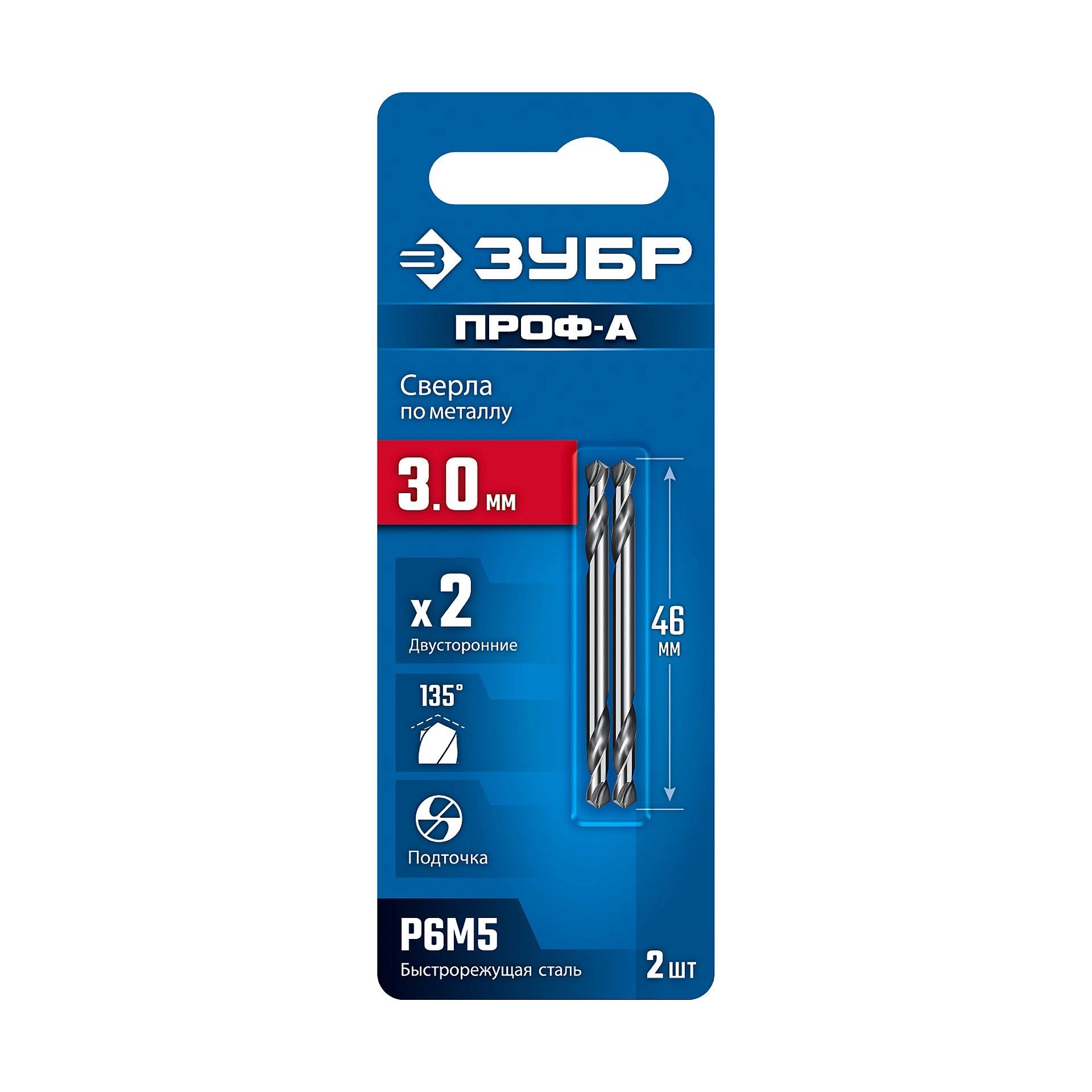 ПроизводителиСверло по металлу ц/х двухстороннее 3.0х46 мм, Р6М5, класс А, 2шт. "Проф-А" (29627-3.0) ЗУБР