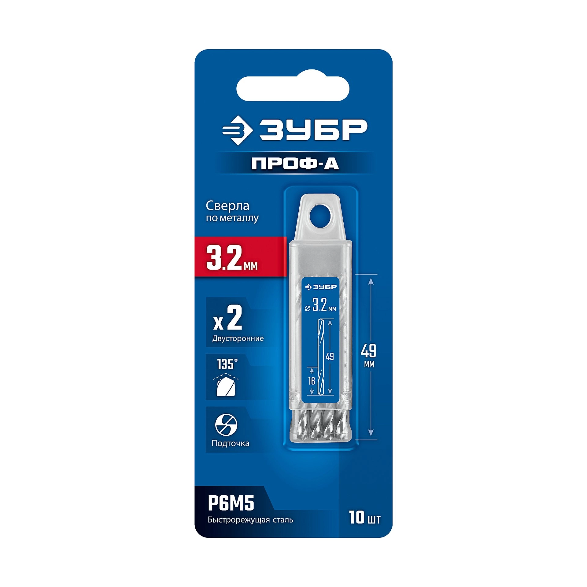 ПроизводителиСверло по металлу ц/х двухстороннее 3.2х49 мм, Р6М5, класс А, 10шт. "Проф-А" (29627-3.2-10) ЗУБР