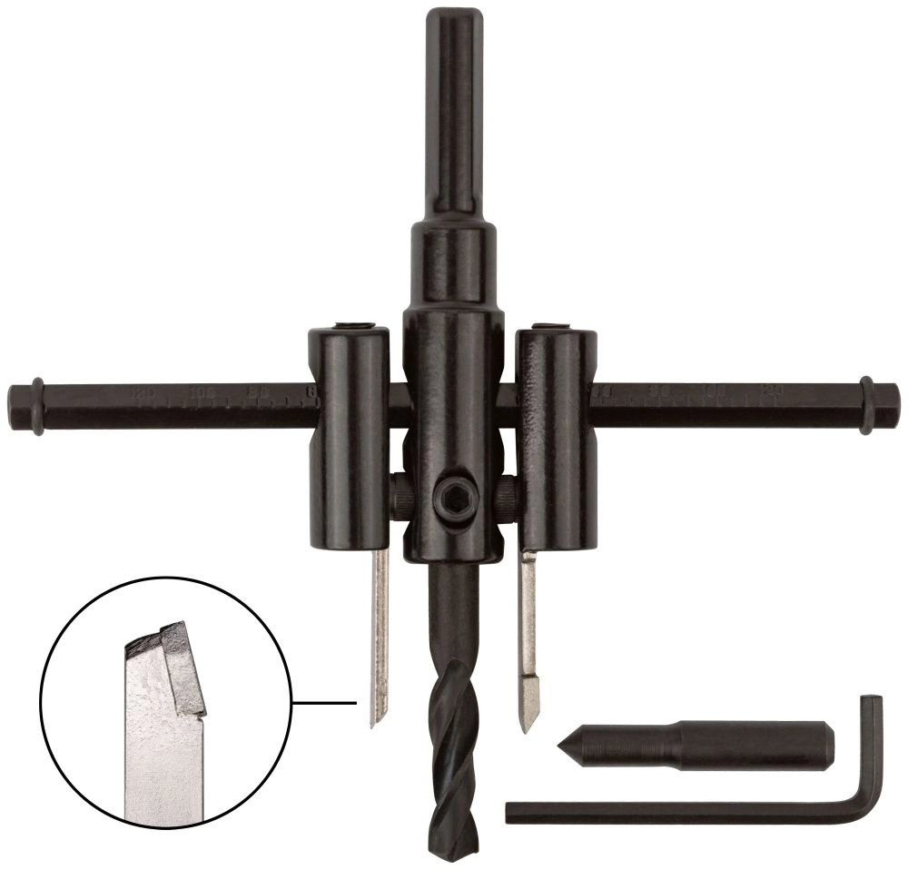 "Балеринка" Для высверливания отверстий в гипсокартоне, дереве. С регулируемым диаметром. Материал: инструментальная сталь, резцы из усиленной легированной инструментальной стали с твердосплавными вставками.Производитель: