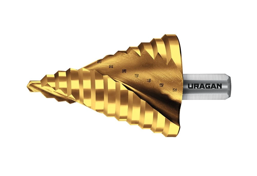 Сверло URAGAN 29658-6-52-12, предназначено для сверления металлических конструкций и заготовок, листовых материалов, цветных металлов, пластика. Множество диаметров в одном сверле для сверления различных листовых материалов. Ø 6 – 52 мм, 12 ступ: Ø 6 - 12 - 16 - 20 - 24 - 28 - 32 - 36 - 40 - 44 - 48 - 52 мм, трехопорный хвостовик 13 мм.Производитель: Крафтул И/Е Гмбх, Альтер Поствег Штр., Лоенинген, Германия