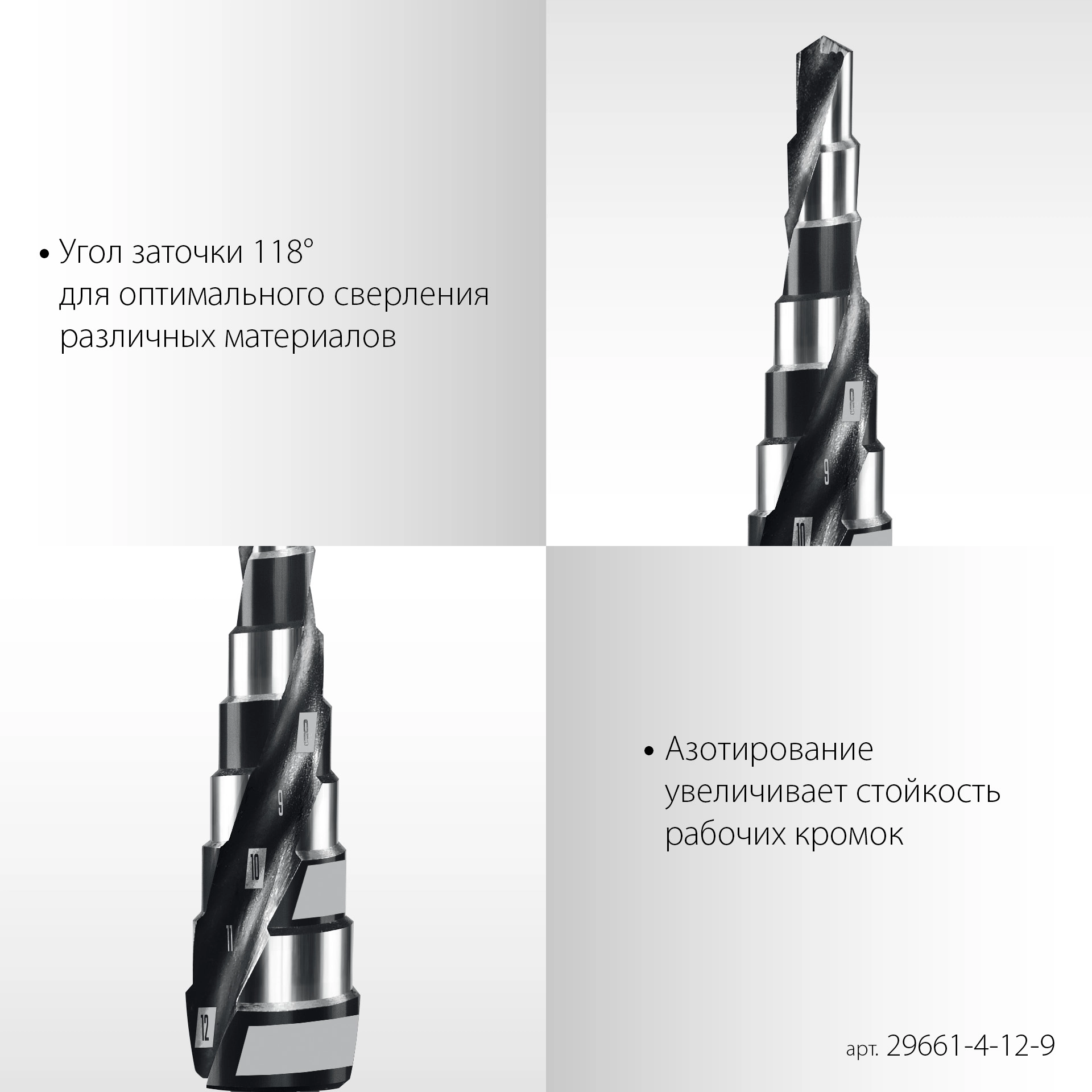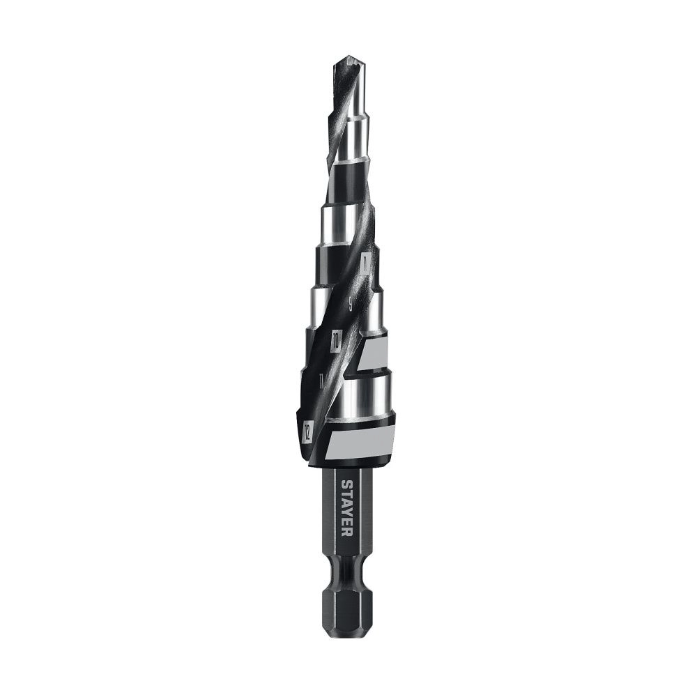 ПроизводителиСверло ступенчатое 4-12 мм, 9 ступеней, винтовая спираль (29661-4-12-9) STAYER