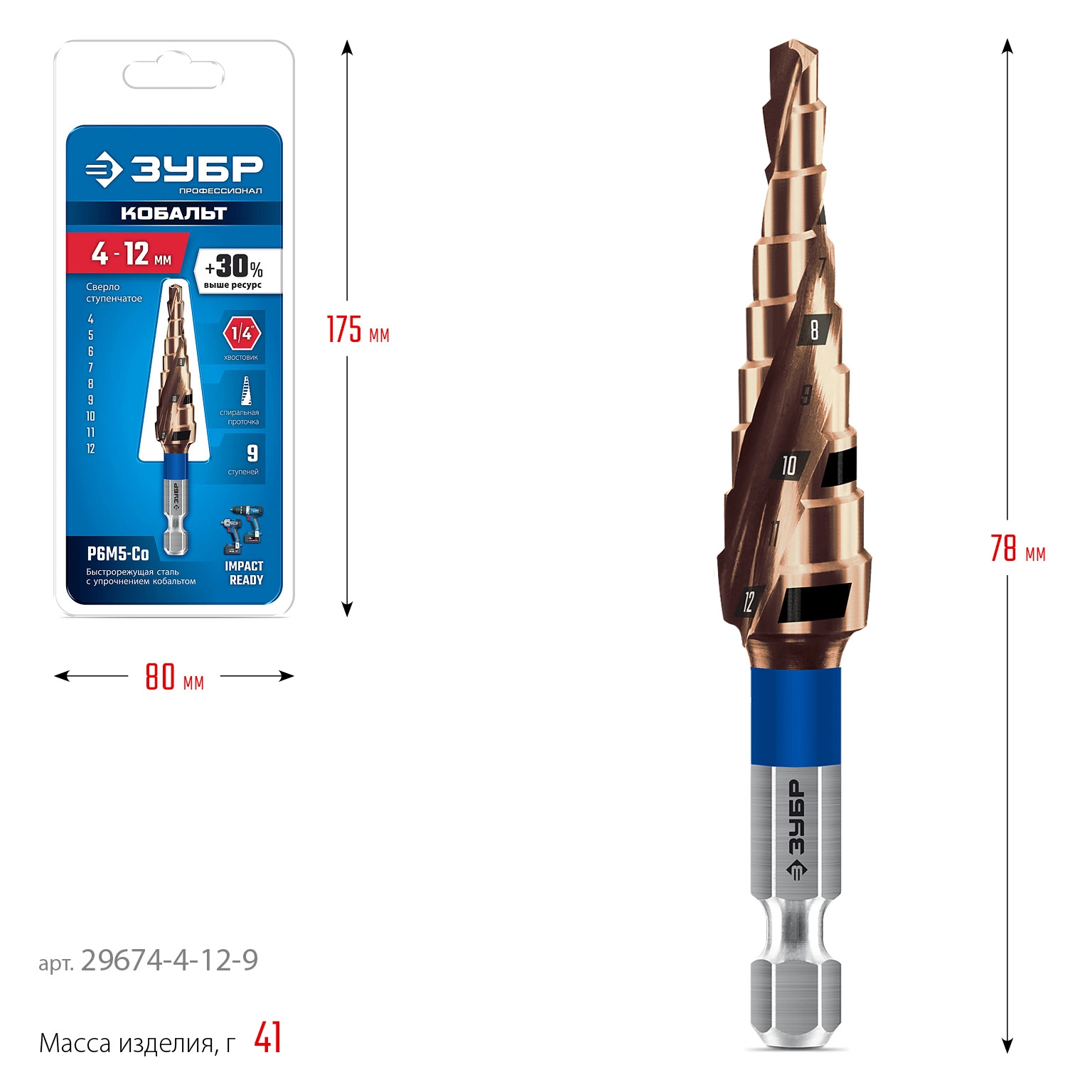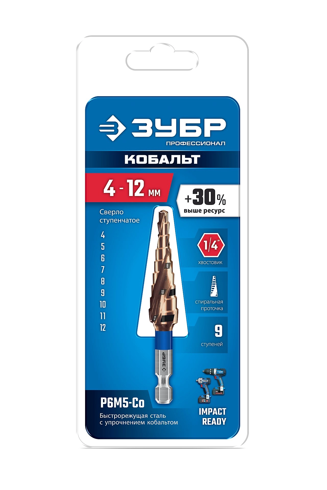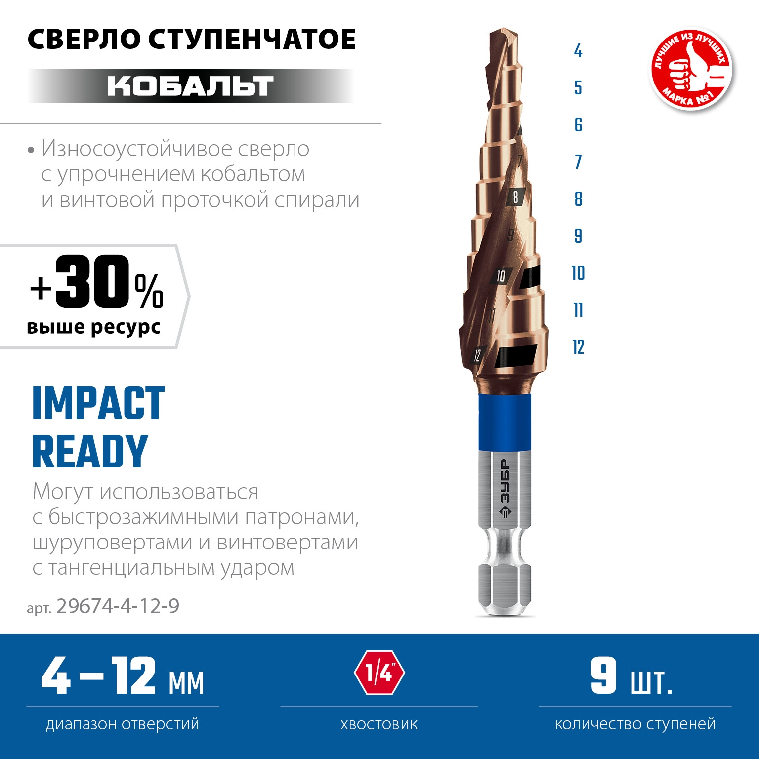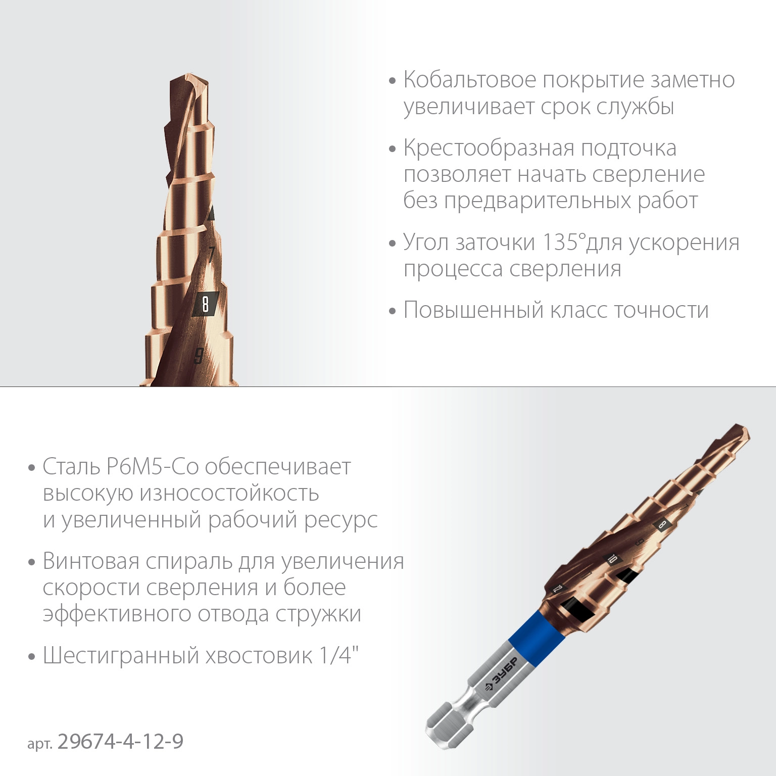 ПроизводителиСверло ступенчатое 4-12мм HSS-Co, 9 ступ., винт. спир., хвос. 1/4" (29674-4-12-9) ЗУБР