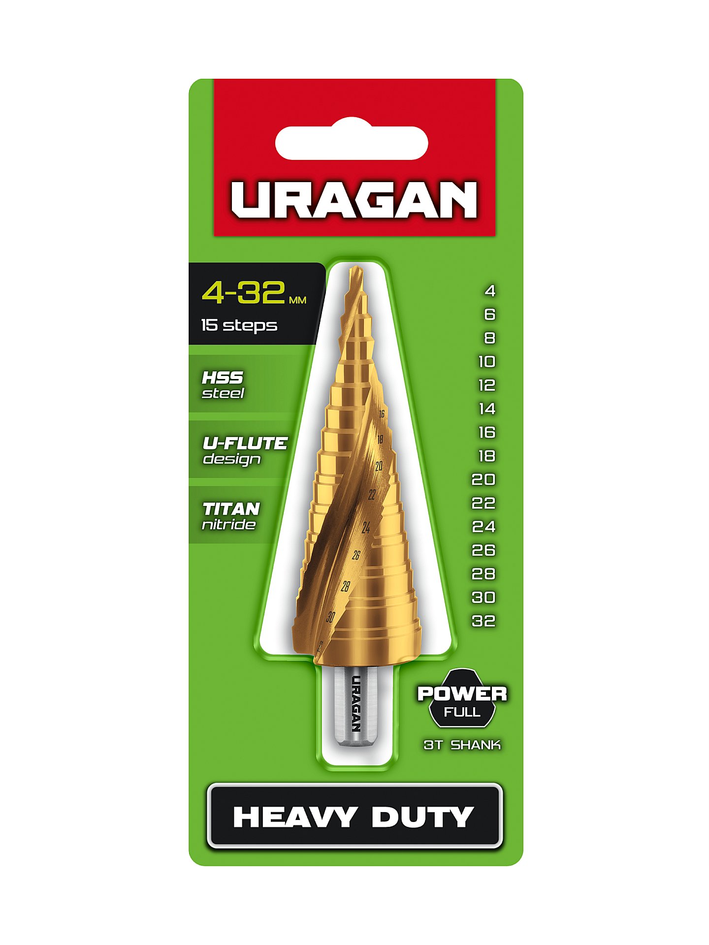 ПроизводителиСверло ступенчатое 4-32 мм, 15 ступеней, винтовая спираль (29658-4-32-15) URAGAN