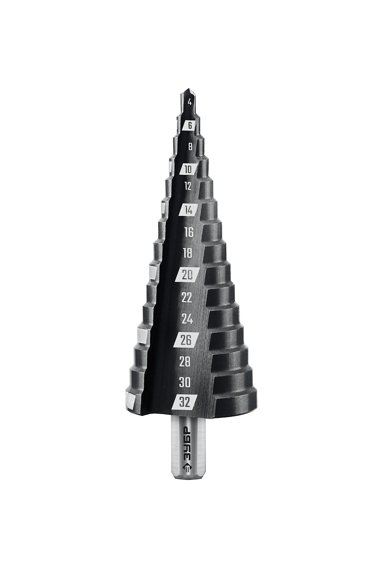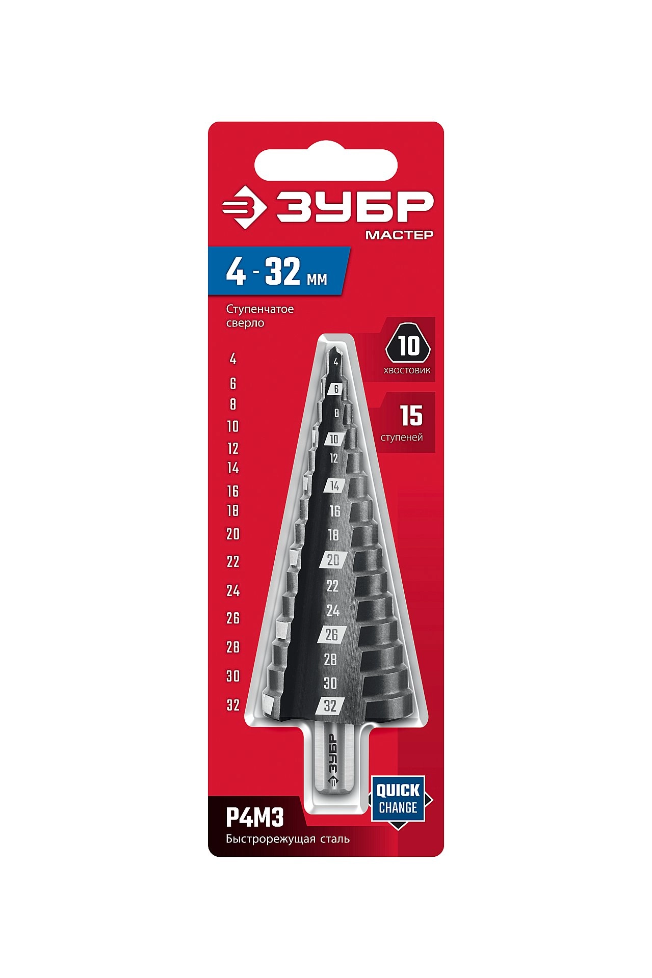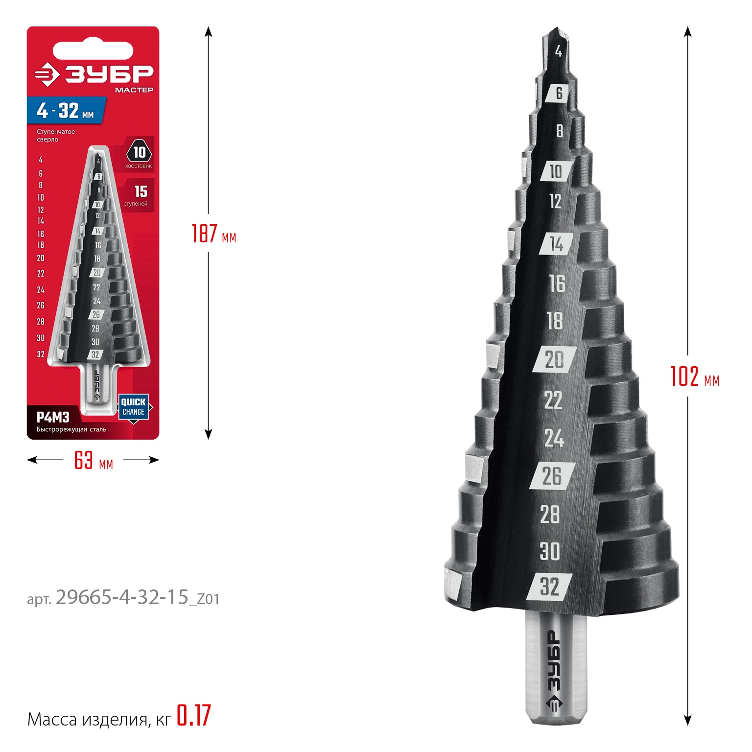 ПроизводителиСверло ступенчатое 4-32мм HSS, 15ступ., по сталям и цвет. мет., 3гр. хвост. (29665-4-32-15_z01) ЗУБР