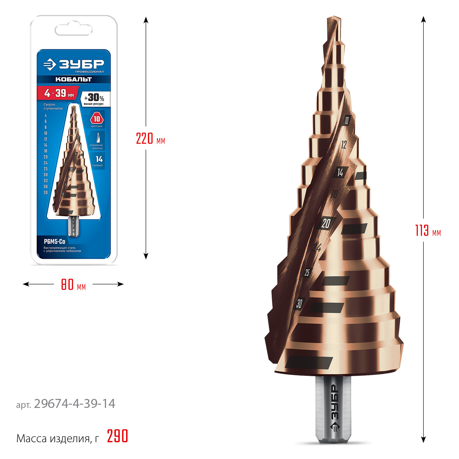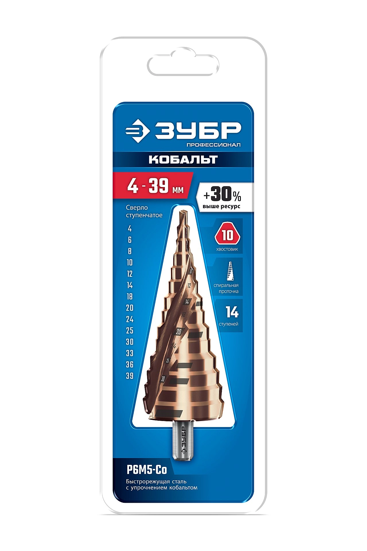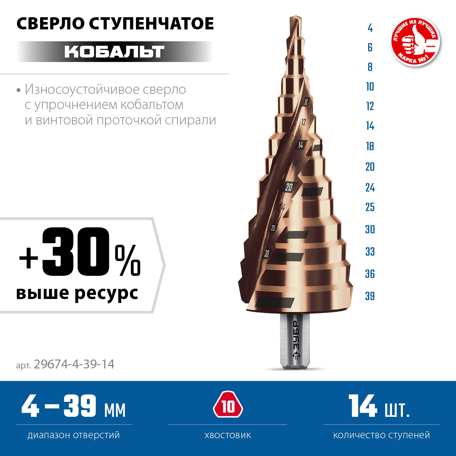ПроизводителиСверло ступенчатое 4-39мм HSS-Co, 14 ступ., винт. спир., хвос. 1/4" (29674-4-39-14) ЗУБР