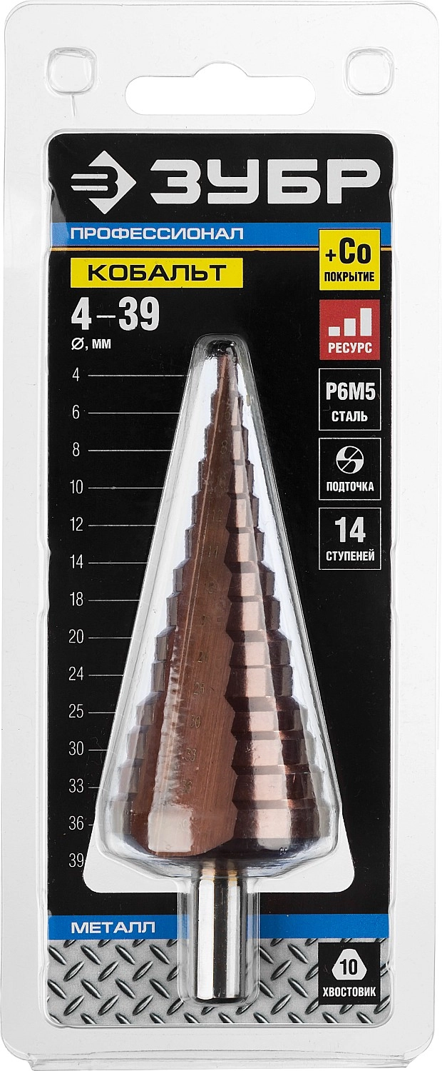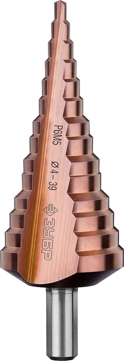 ПроизводителиСверло ступенчатое 4-39мм HSS-Co, 14 ступеней "КОБАЛЬТ" (29672-4-39-14_z01) ЗУБР