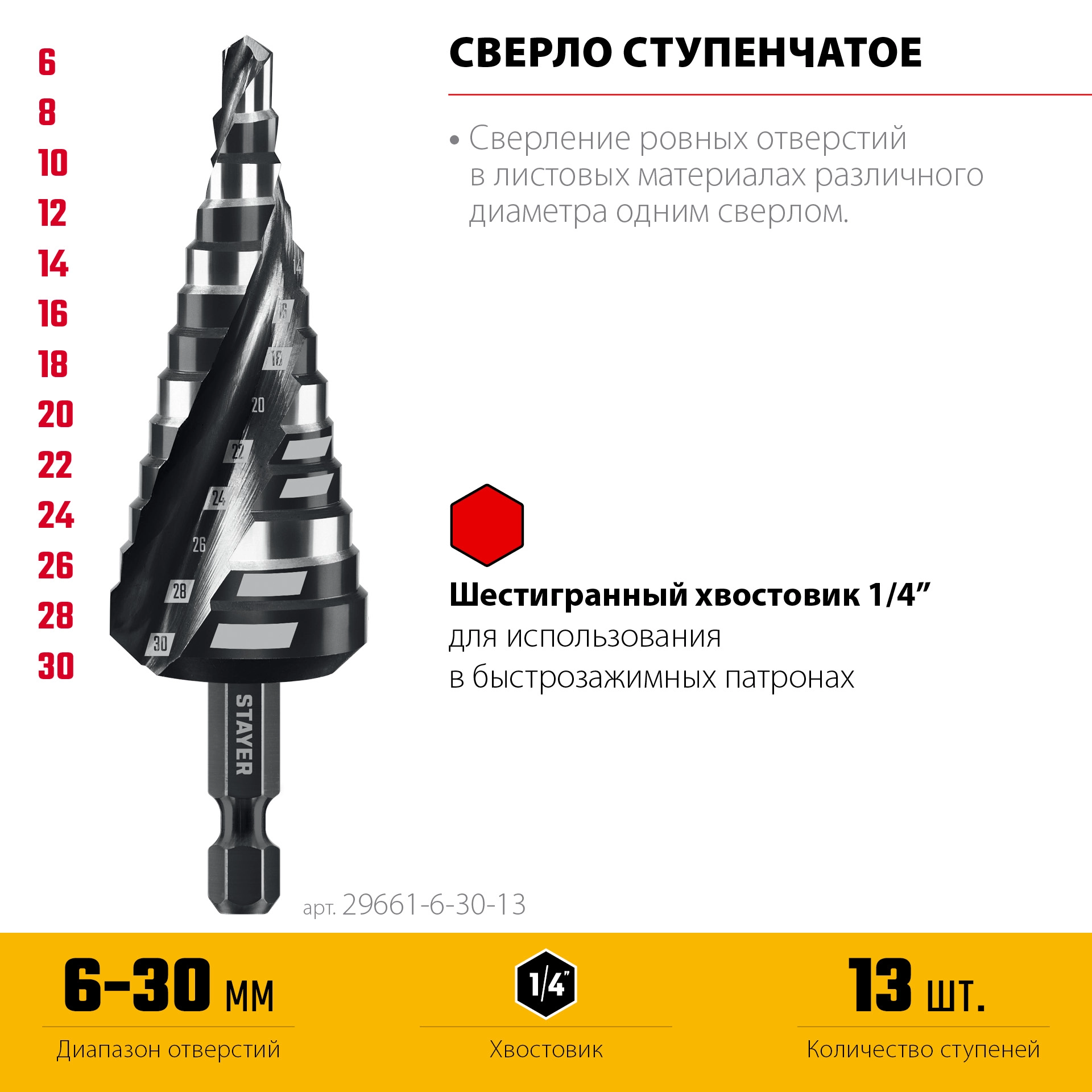 ПроизводителиСверло ступенчатое 6-30 мм, 13 ступеней, винтовая спираль (29661-6-30-13) STAYER