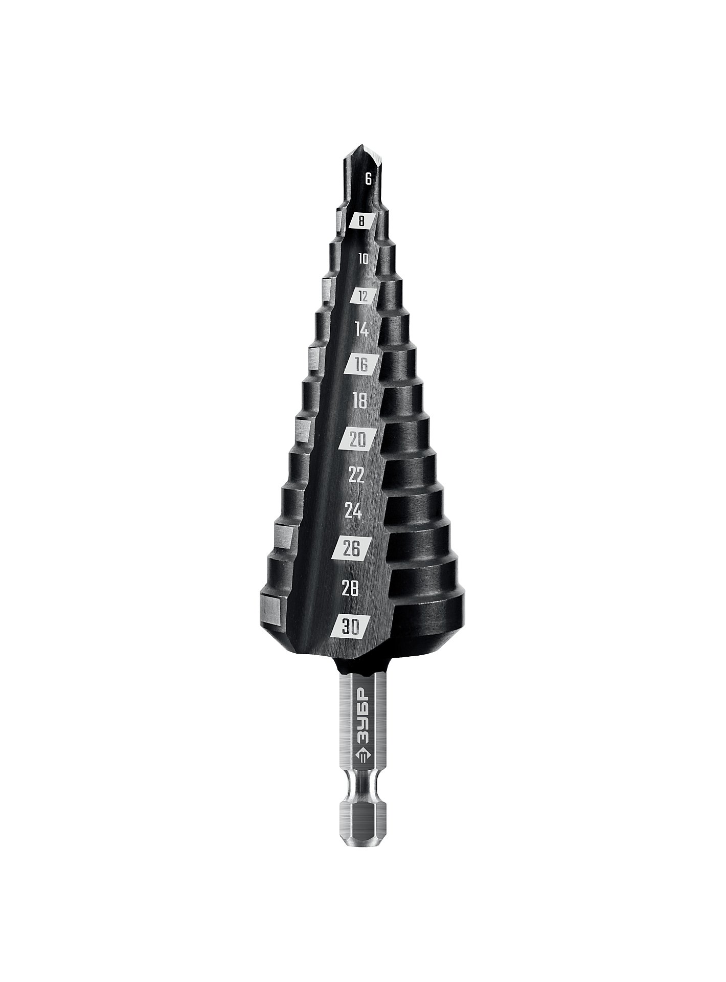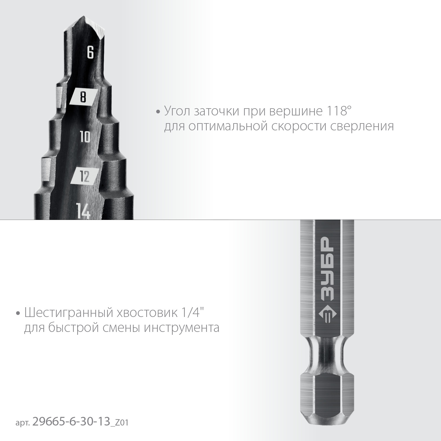 ПроизводителиСверло ступенчатое 6-30мм HSS, 13ступ., по сталям и цвет. мет., хвост. 1/4" (29665-6-30-13_z01) ЗУБР