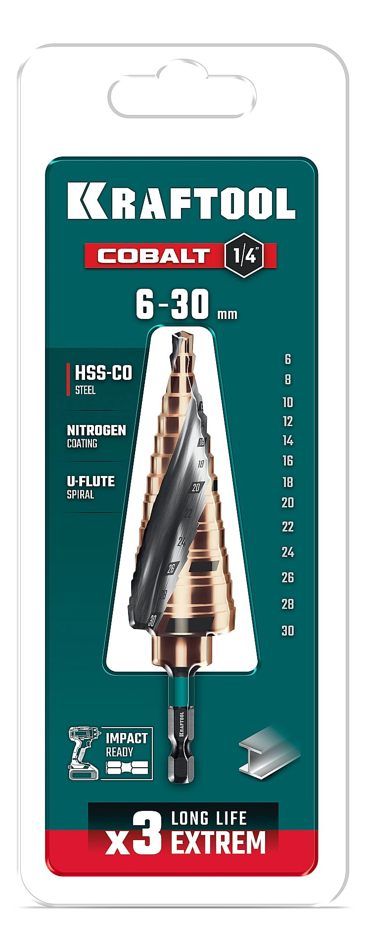 ПроизводителиСверло ступенчатое 6-30мм HSS-Co, 13 ступ., винт. спир., хвос. 1/4" (29691-6-30-13) KRAFTOOL