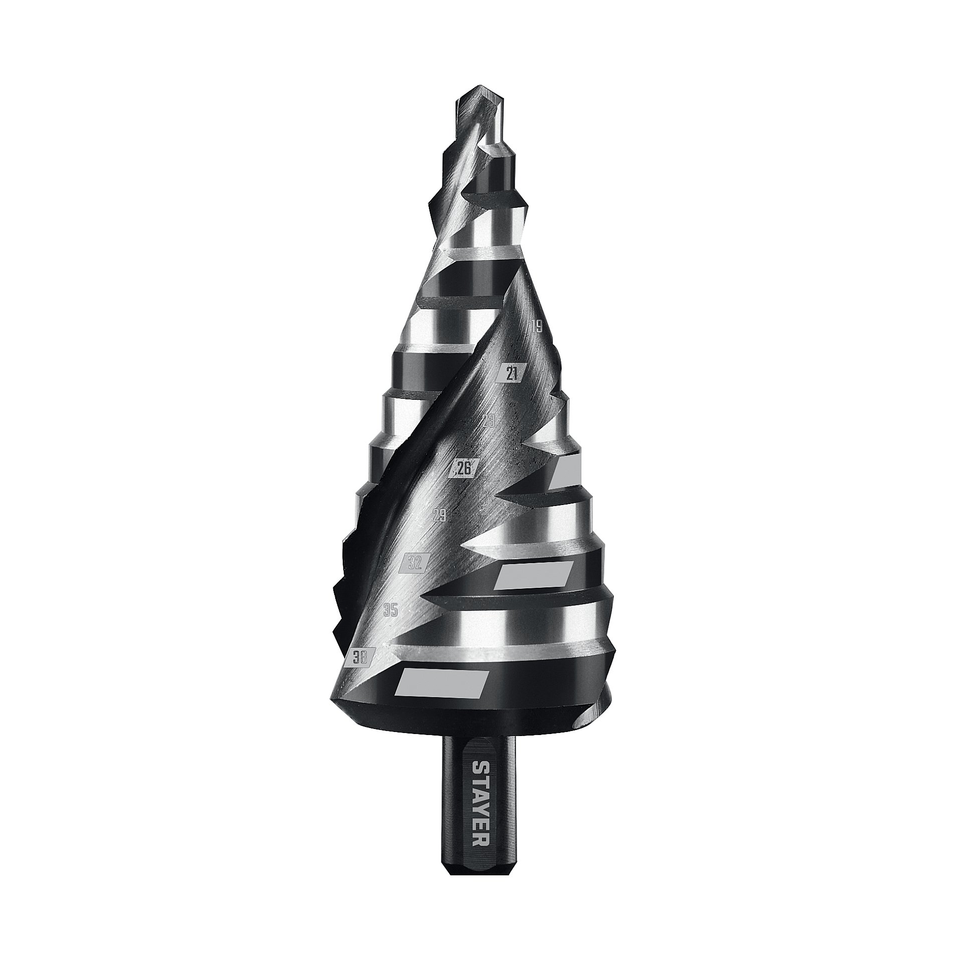 ПроизводителиСверло ступенчатое 6-38 мм, 12 ступеней, винтовая спираль (29661-6-38-12) STAYER