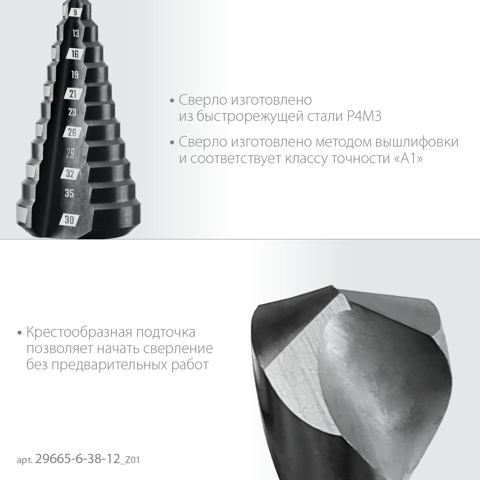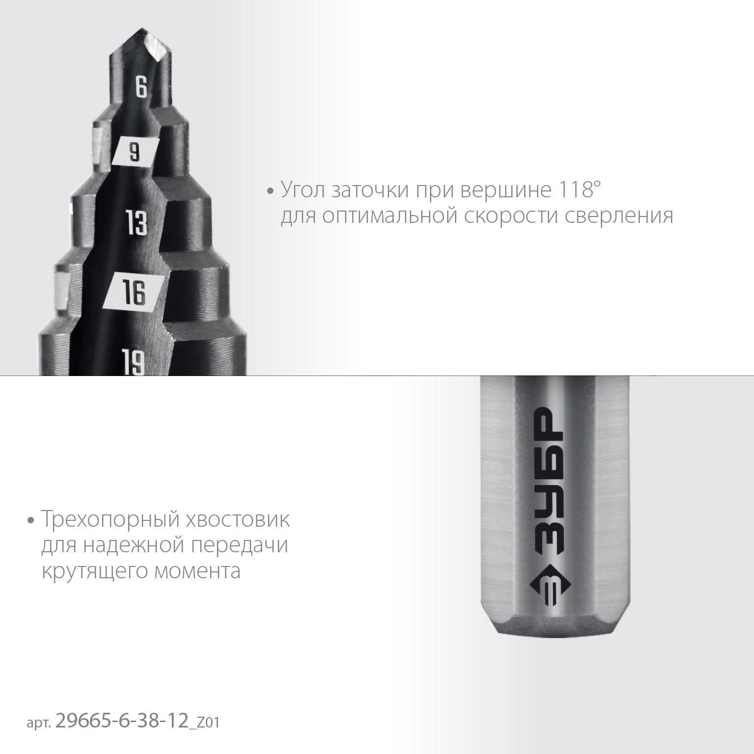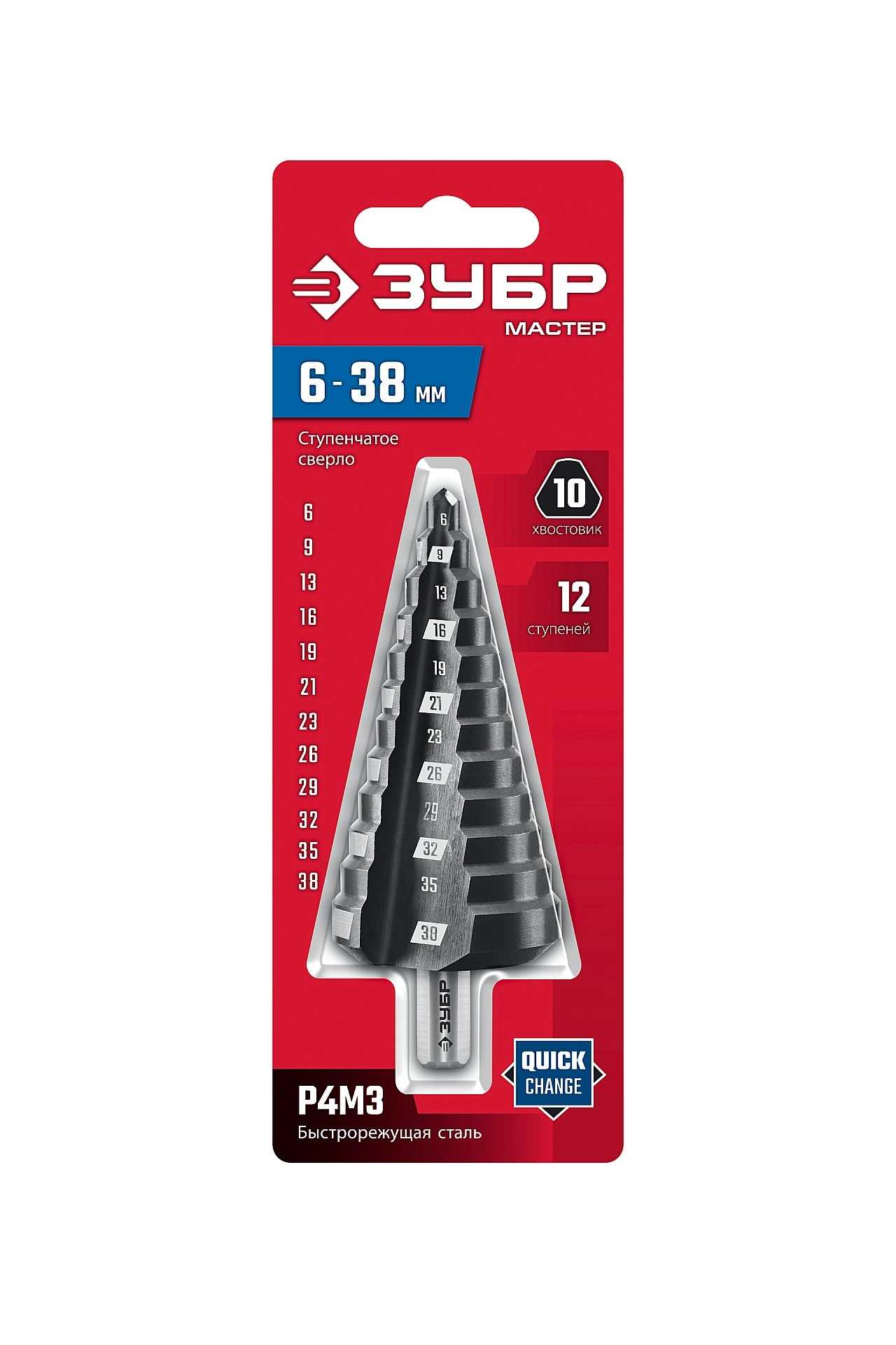 ПроизводителиСверло ступенчатое 6-38мм HSS, 12ступ., по сталям и цвет. мет., хвост. 1/4" (29665-6-38-12_z01) ЗУБР