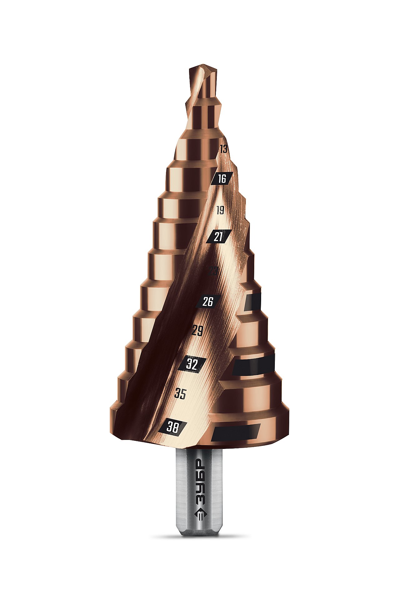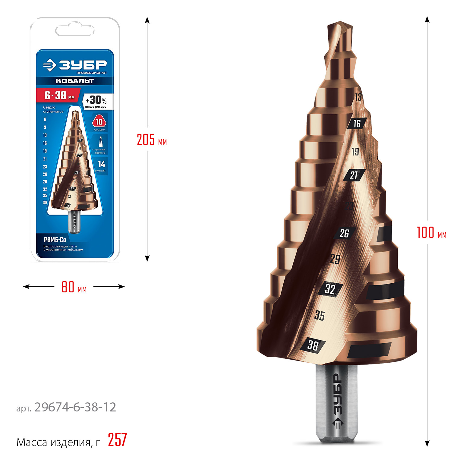 ПроизводителиСверло ступенчатое 6-38мм HSS-Co, 12 ступ., винт. спир., 3-гр. хвост. (29674-6-38-12) ЗУБР