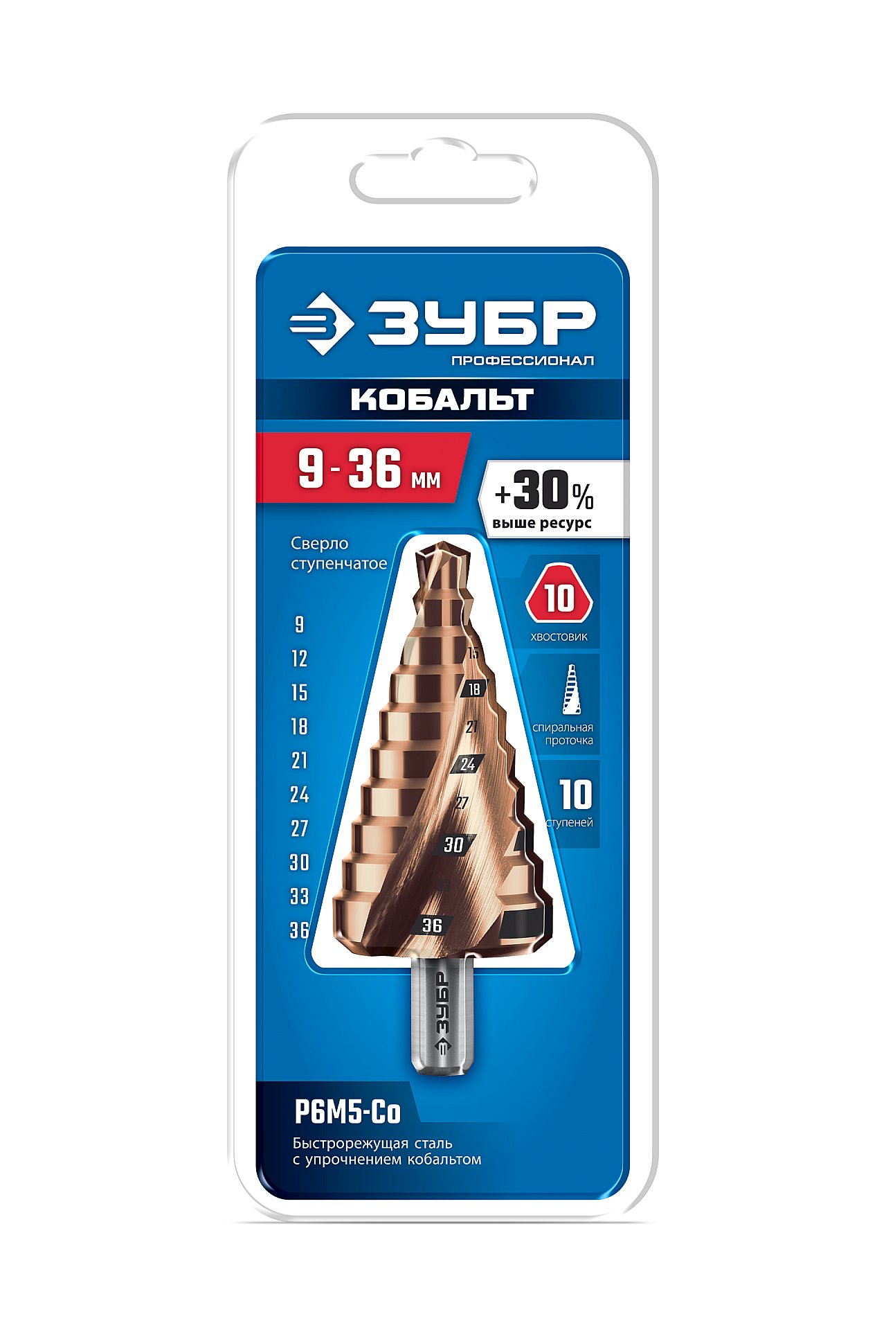 ПроизводителиСверло ступенчатое 9-36мм HSS-Co, 10 ступ., винт. спир., 3-гр. хвост. (29674-9-36-10) ЗУБР