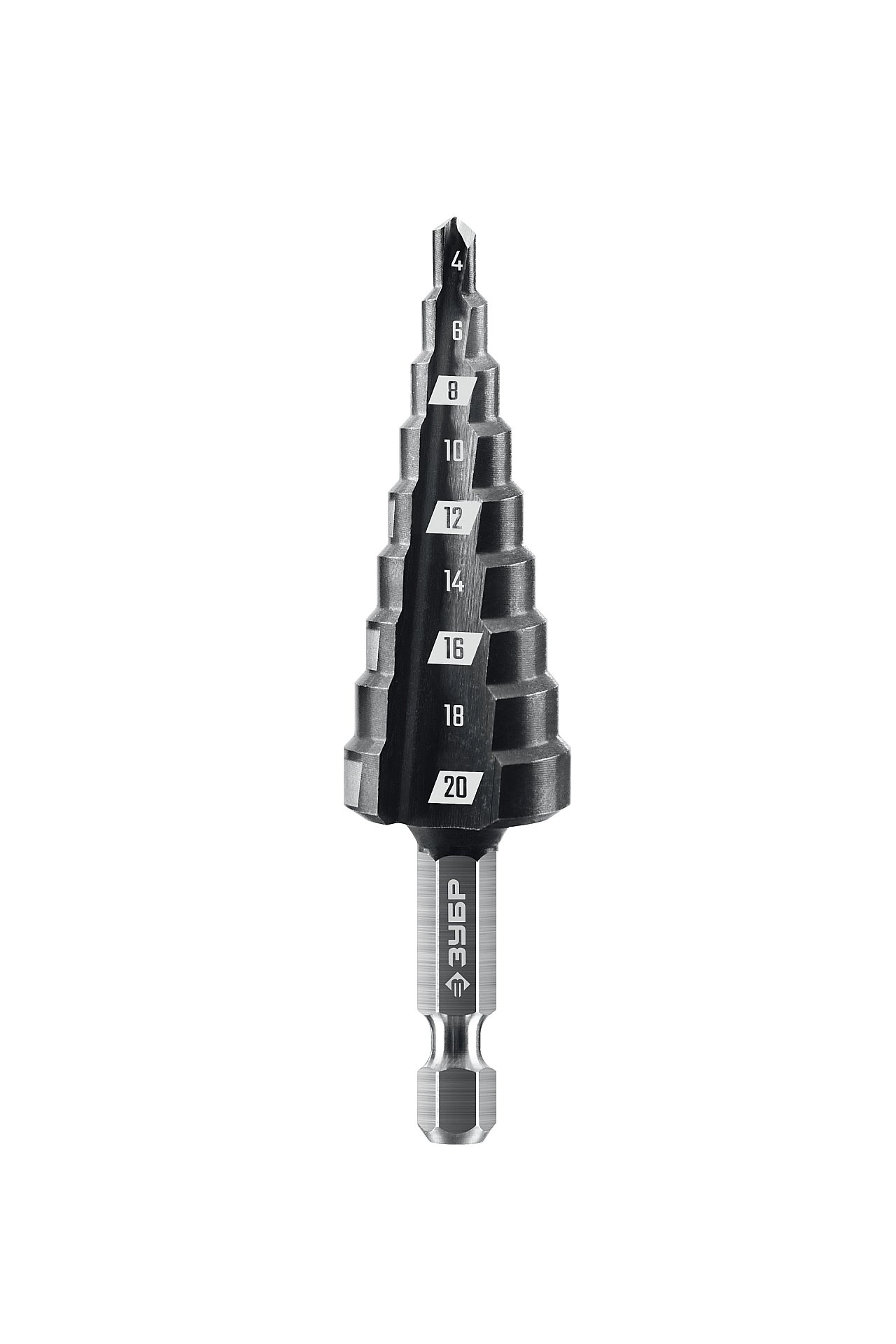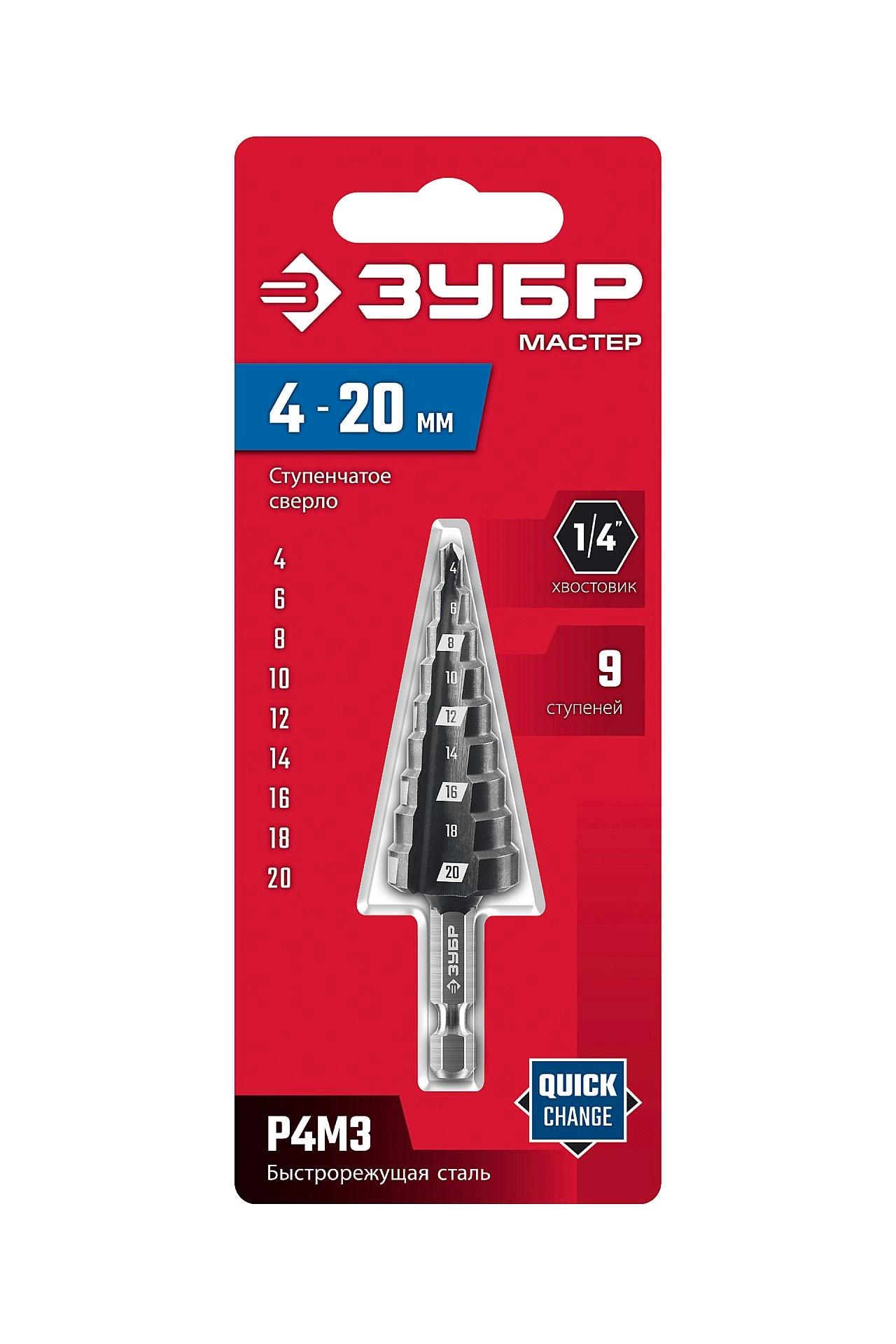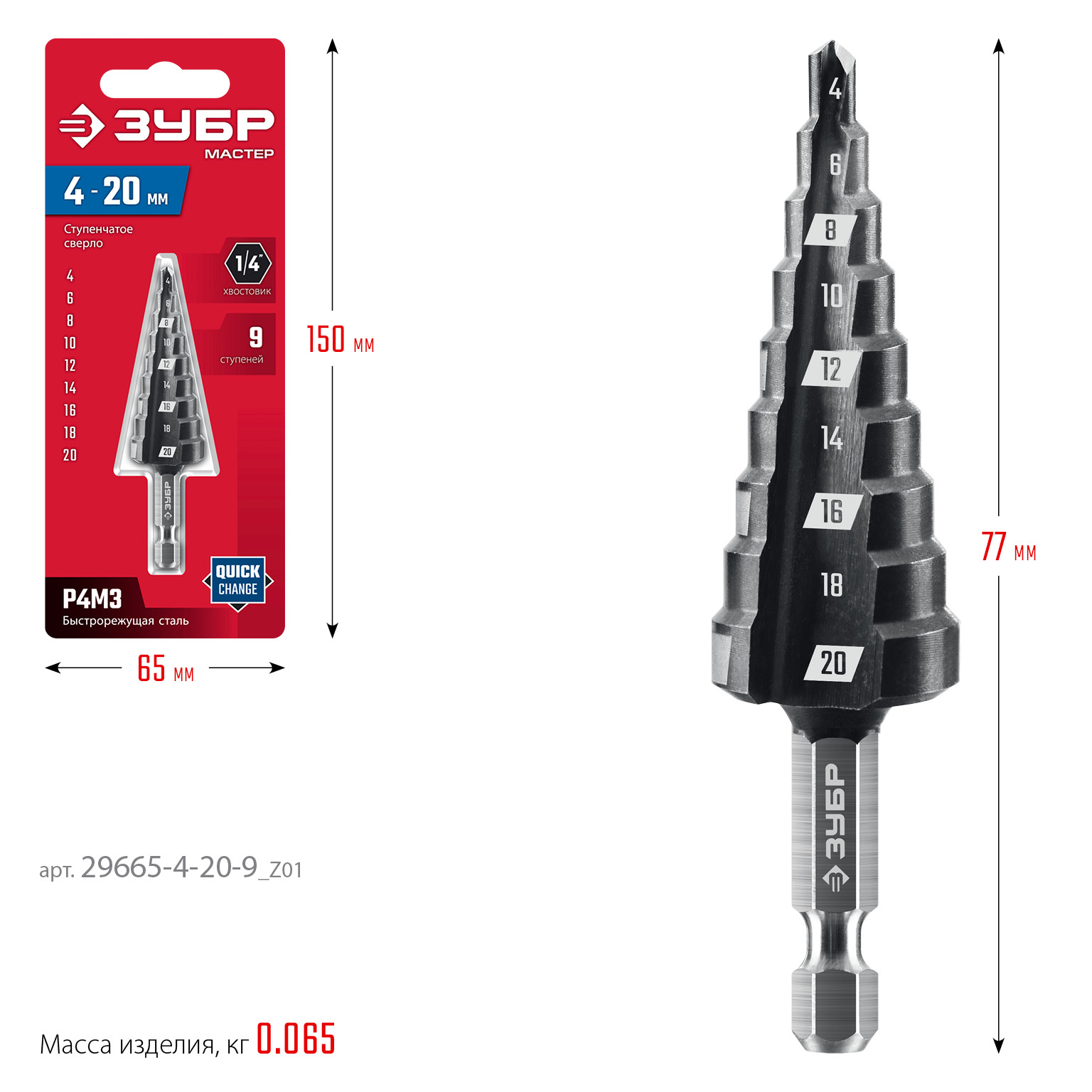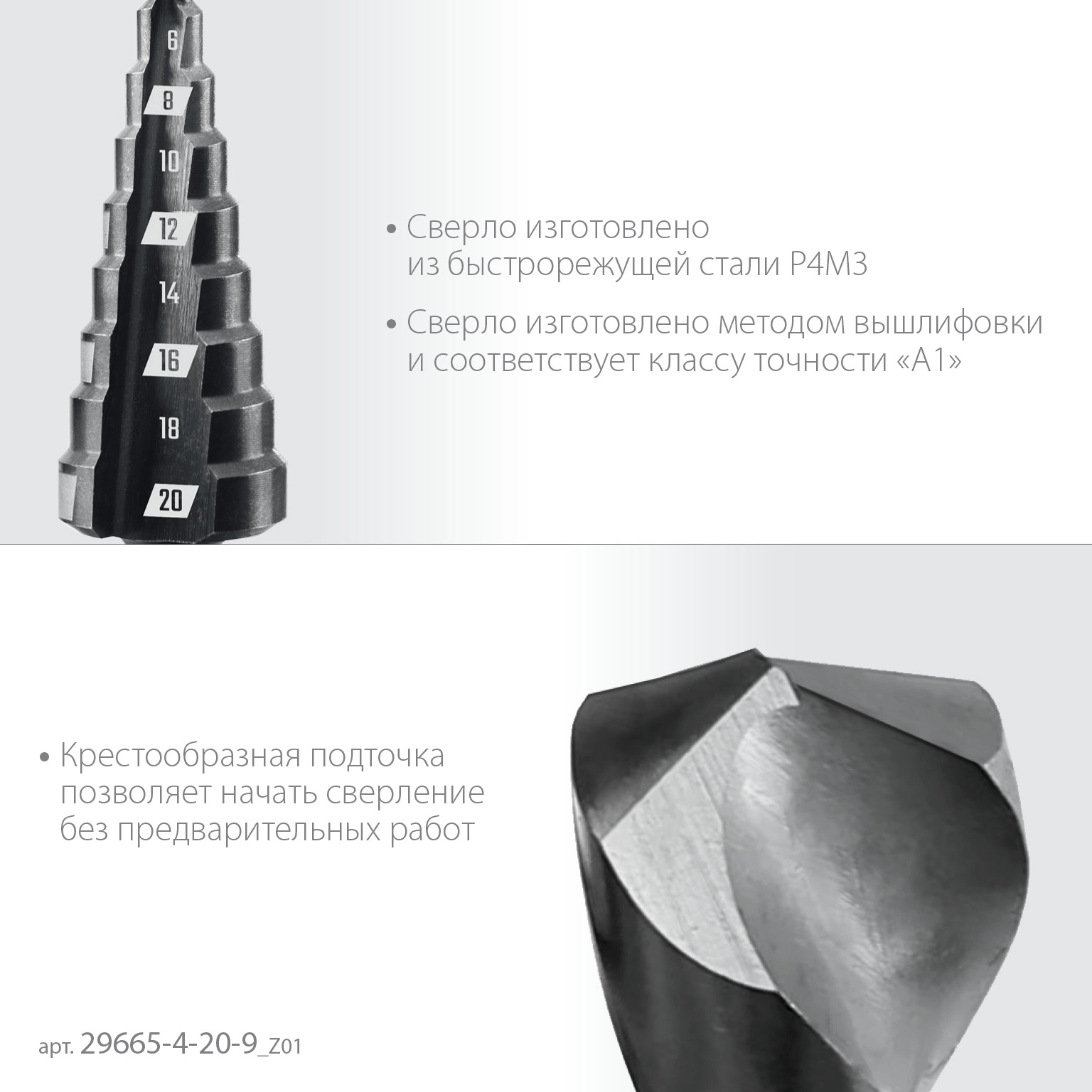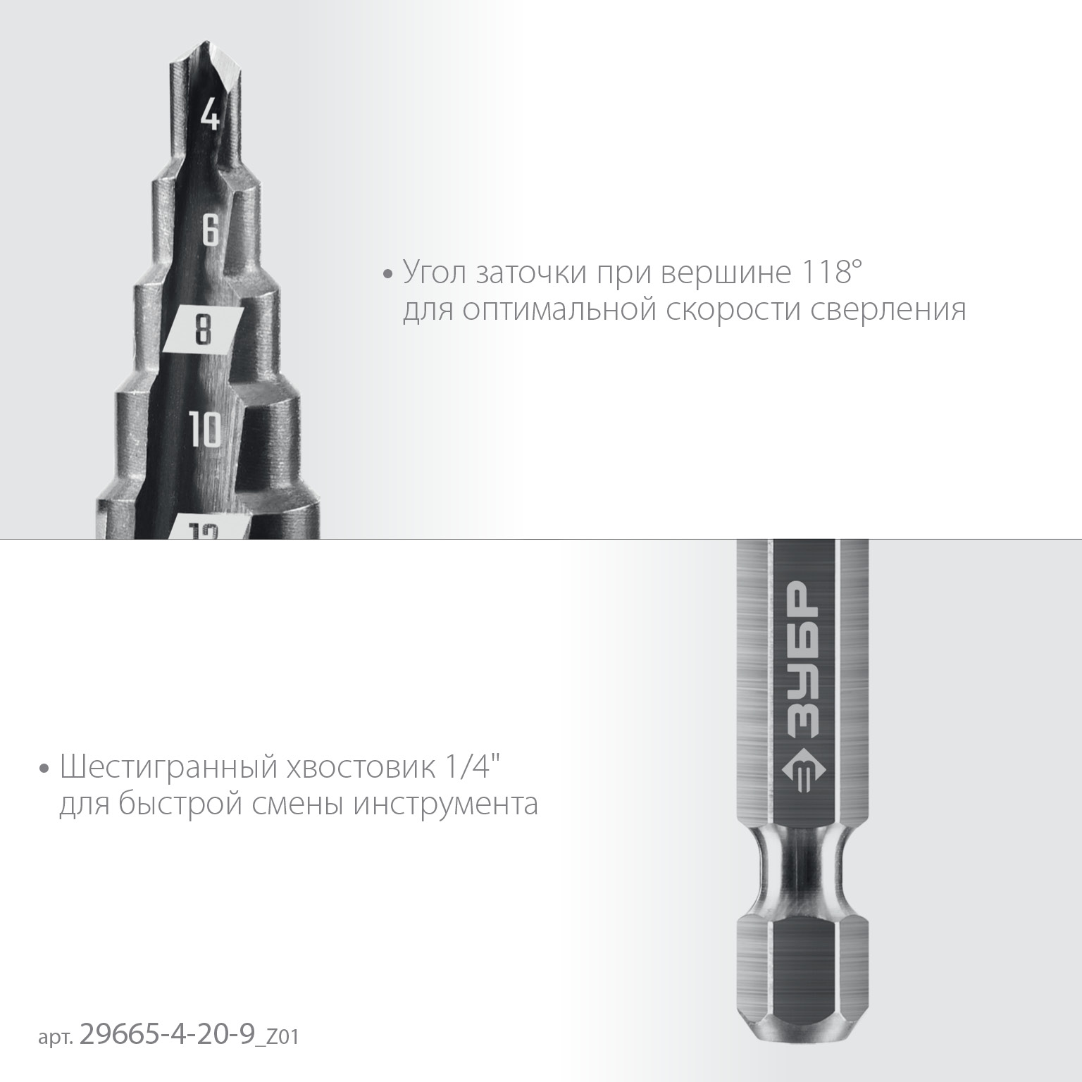 ПроизводителиСверло ступенчатое,9 ступеней,4-20мм (29665-4-20-9_z01) ЗУБР