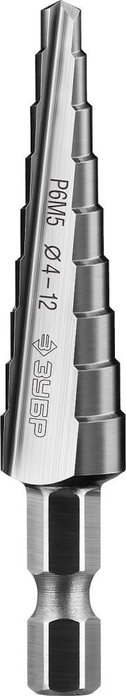 ПроизводителиСверло ступенчатое 4-12мм HSS, 9 ступ., по сталям и цв. мет., хвос. 1/4" (29670-4-12-9_z01) ЗУБР