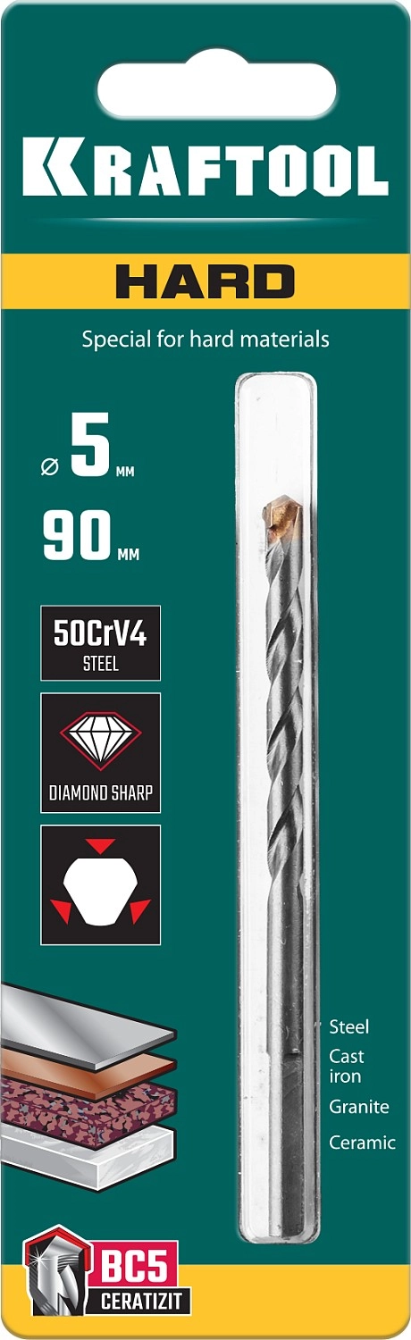 ПроизводителиСверло универсальное по по твёрдым материалам, 5х90мм, ц/х хв. "HARD" (29177-090-5) KRAFTOOL