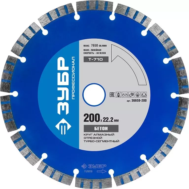 ПроизводителиТ-710 БЕТОН 200 мм, диск алмазный отрезной по высокопрочному бетону, Профессионал (36658-200) ЗУБР