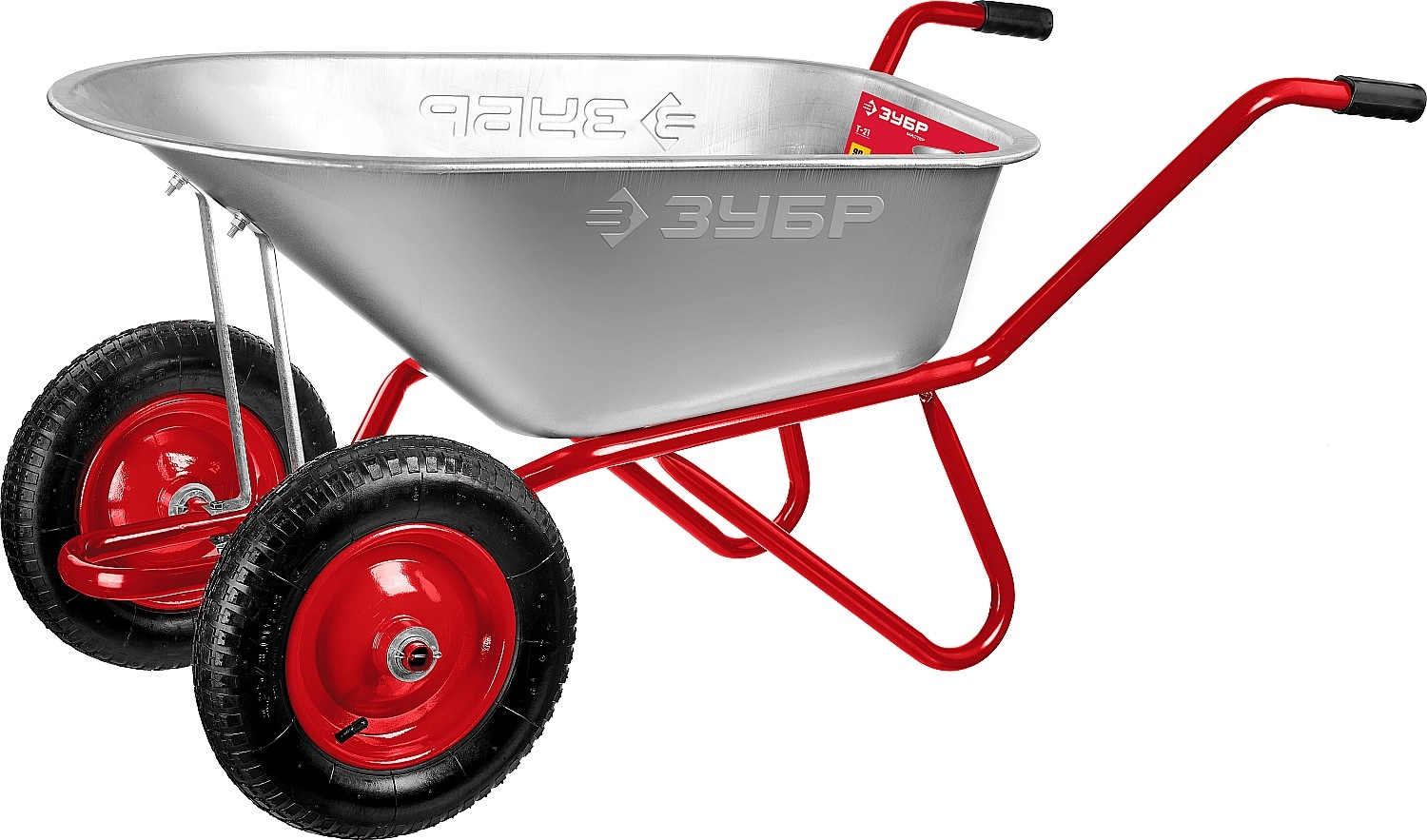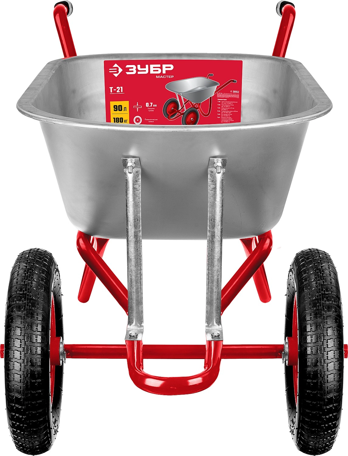 ПроизводителиТачка садово-строительная двухкколесная, пневматическое колесо,90 л, 180кг,Т-21 (39952) ЗУБР
