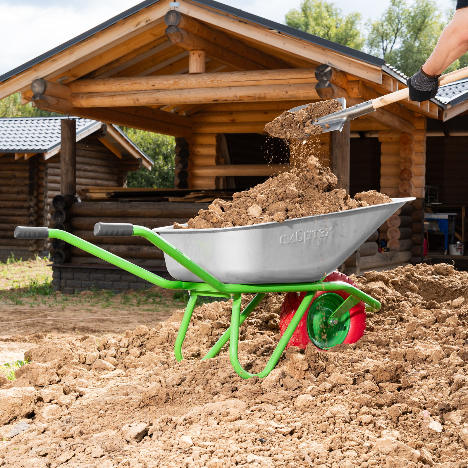 Садово-строительная тачка Сибртех 68968 с PU колесом, грузоподъемностью 180 кг и объемом кузова 90 л, используется для перемещения грунта, песка, мусора, веток или строительных смесей. Будет полезна на строительной площадке и дачном участке. Благодаря одному колесу тачка очень маневренна, ее удобно разворачивать и провозить в узких местах.