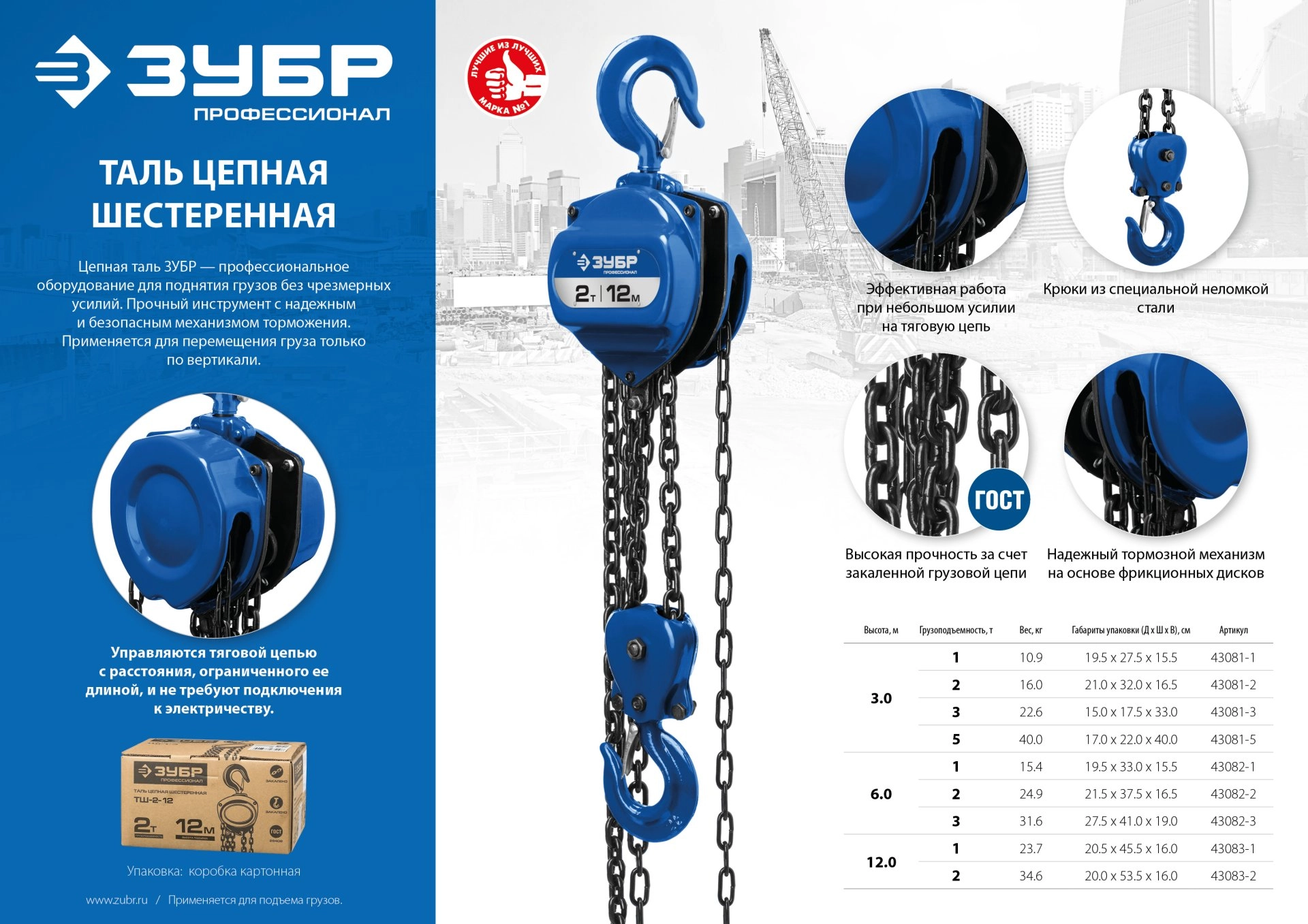 ПроизводителиТаль цепная "ТШ-3-6" шестеренная, Профессионал 43082-3, 3т / 6м (43082-3_z01) ЗУБР