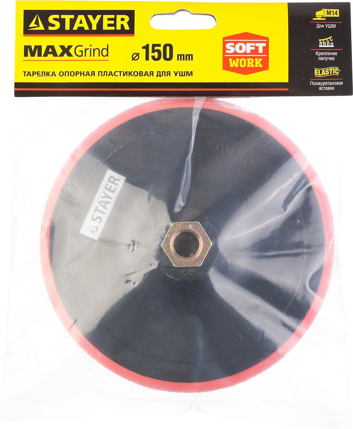 ПроизводителиТарелка опорная с липучкой к УШМ, жесткая, d=150мм/М14 (35744-150) STAYER