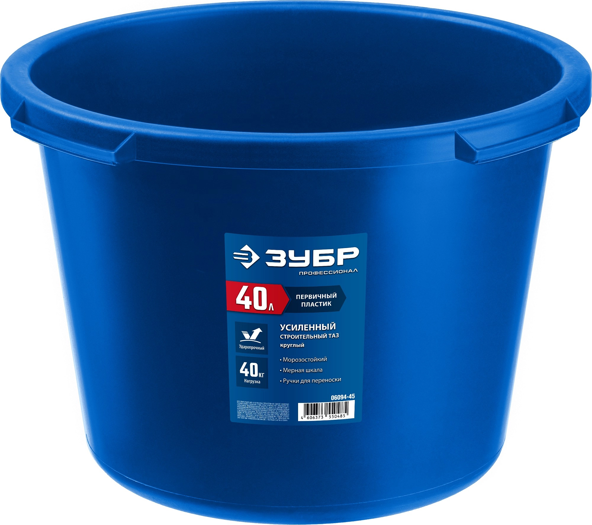 ПроизводителиТаз строительный круглый, 40л, усиленный, первичный высокопрочный пластик (06094-45) ЗУБР
