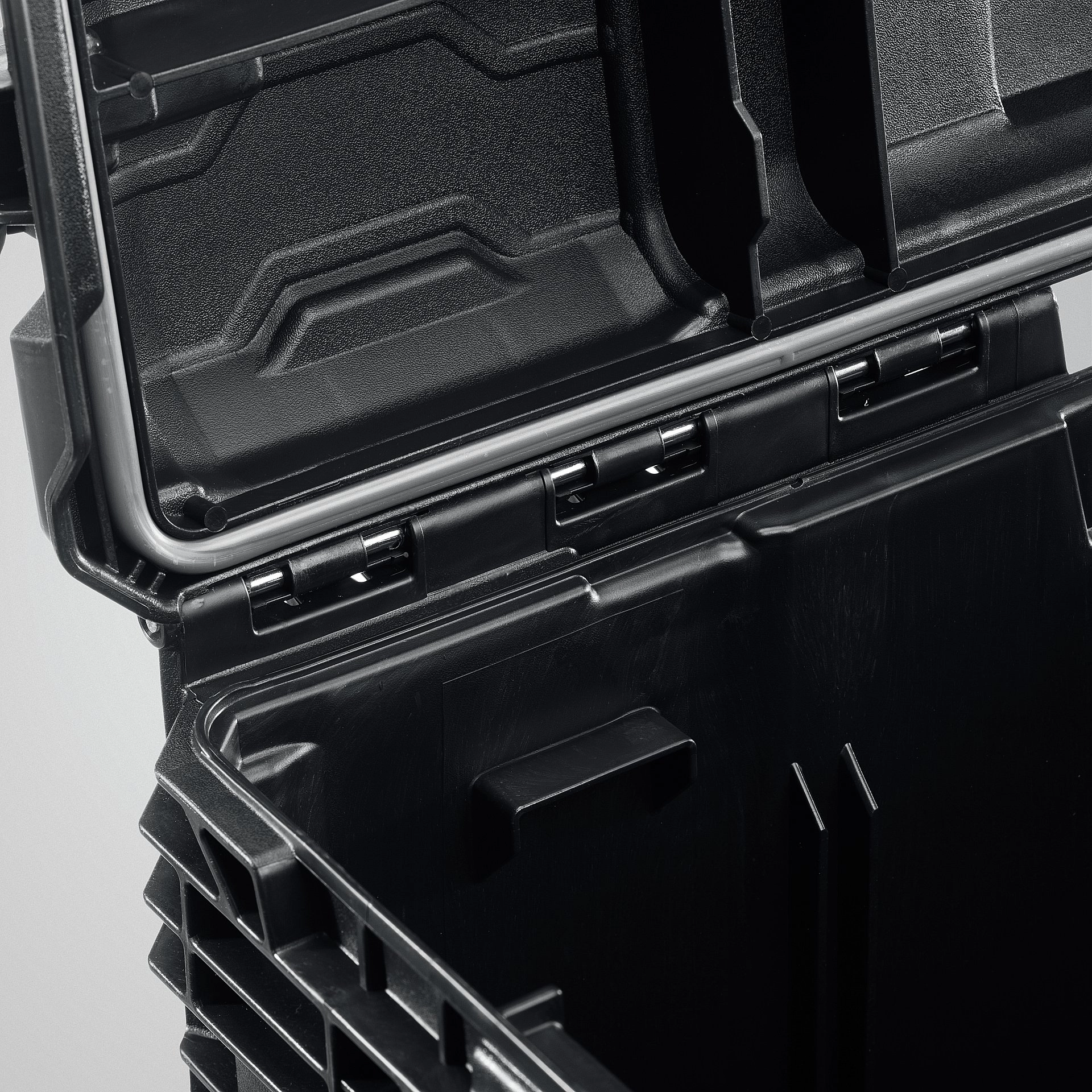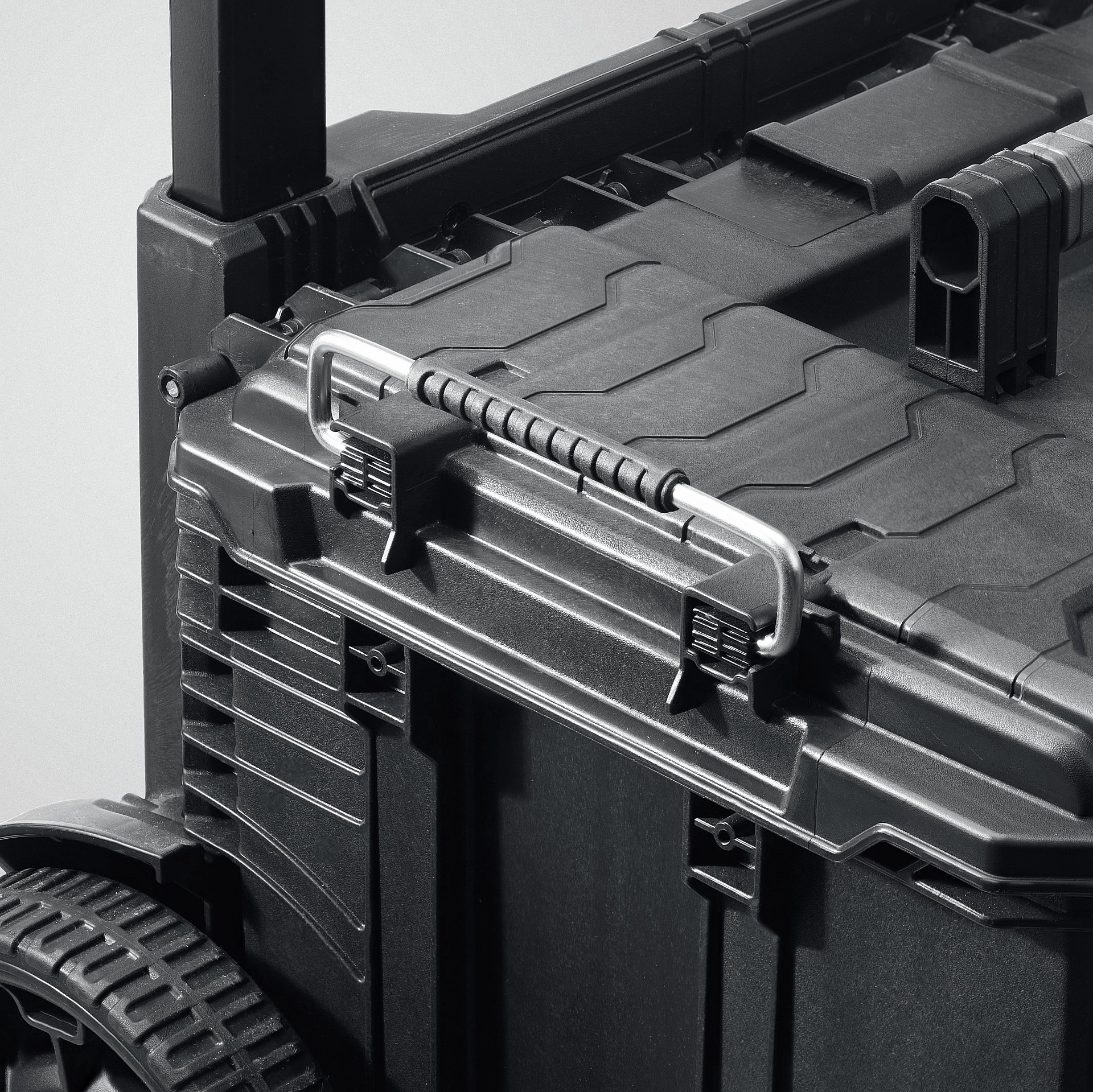 - Данная модель оснащена специальными боковыми металлическими ручками для установки дополнительных блоков один на другой. Это позволяет создать единую надежную конструкцию и перевозить большие объемы инструмента.