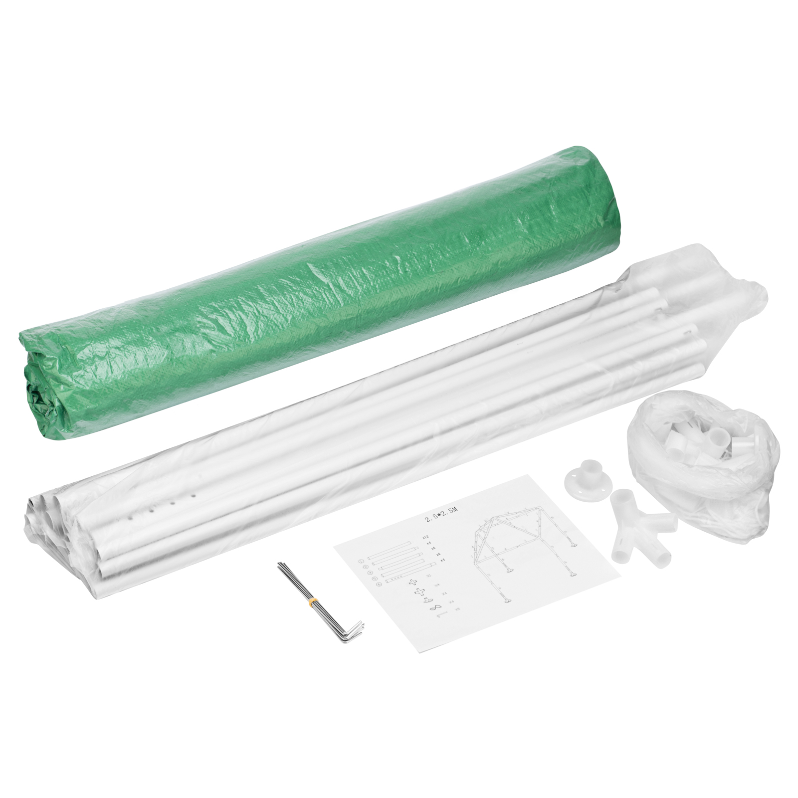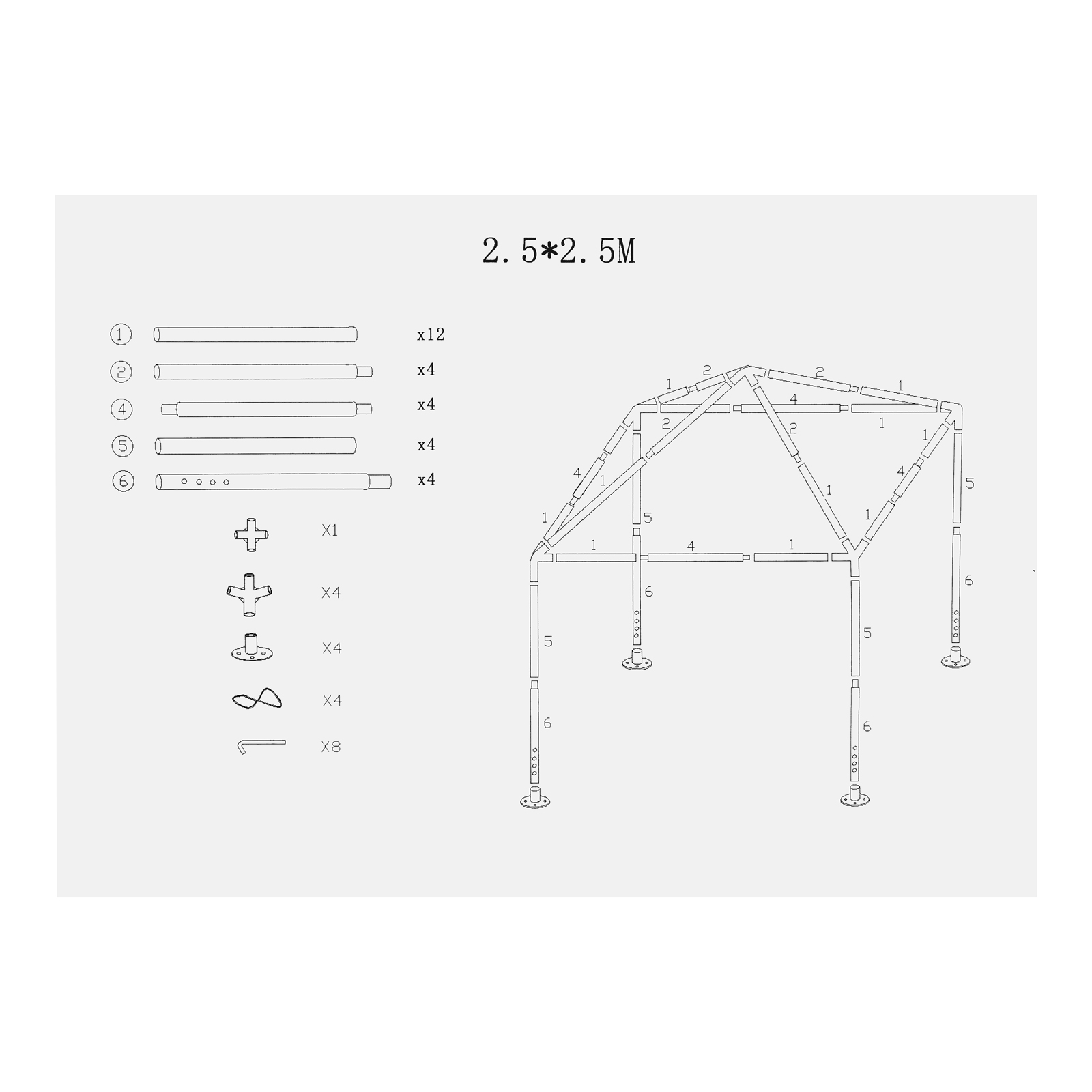 Комплектация: Опоры стоек - 4 шт, Боковое угловое крепление трубок - 4 шт, Центральное угловое крепление трубок - 1 шт, Трубка1 - 12 шт, Трубка2 - 4 шт, Трубка3 - 4 шт, Трубка4 - 4 шт, Трубка5 - 4 шт, Колышки - 8шт, Веревка, длина 3000 мм - 4 шт, Тент с москитной сеПроизводитель: ООО "Мир инструмента", Россия