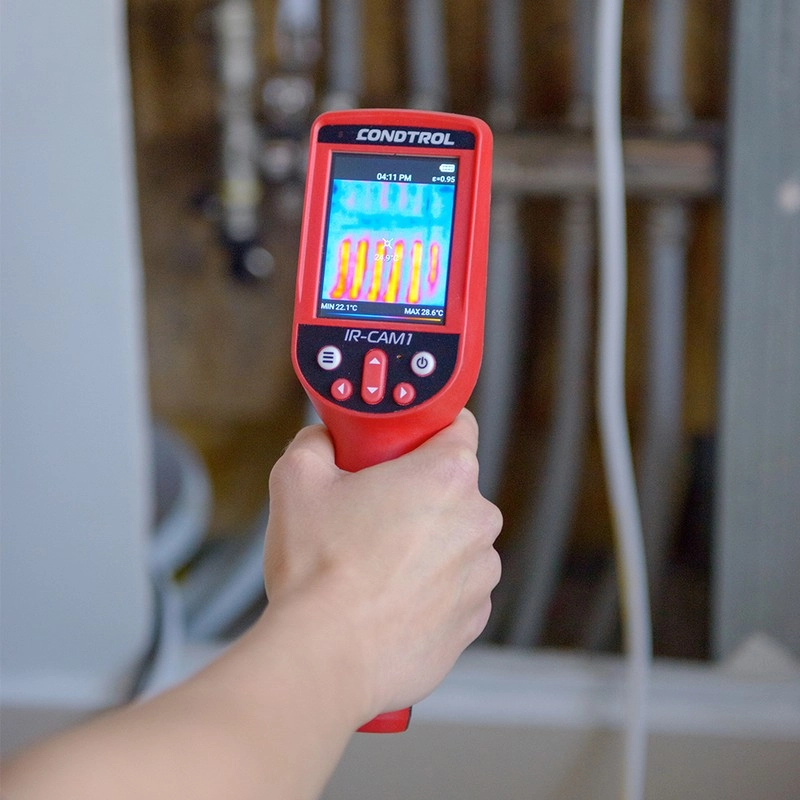 Многофункциональный тепловизор CONDTROL IR-CAM 1 (артикул 3-17-023), предназначенный для бесконтактного измерения температуры поверхностей. Прибор широко используется строительными компаниями, сервисными службами и обслуживающими организациями для мониторинга энергопотерь и контроля производственных процессов.Температурный диапазон: от –50 °С до +1000 °С, что позволяет применять его для высокотемпературных измерений.