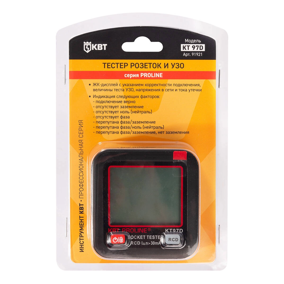 ПроизводителиТестер розеток и УЗО КТ 97D серия PROLINE (91921) КВТ