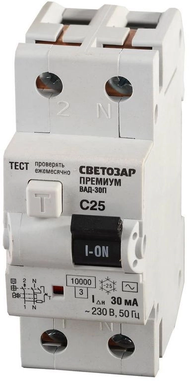 Выключатель дифф. автоматический СВЕТОЗАР "ПРЕМИУМ", 2-полюсный, 25 A, "C", "AC", откл.диф.ток. 30 м