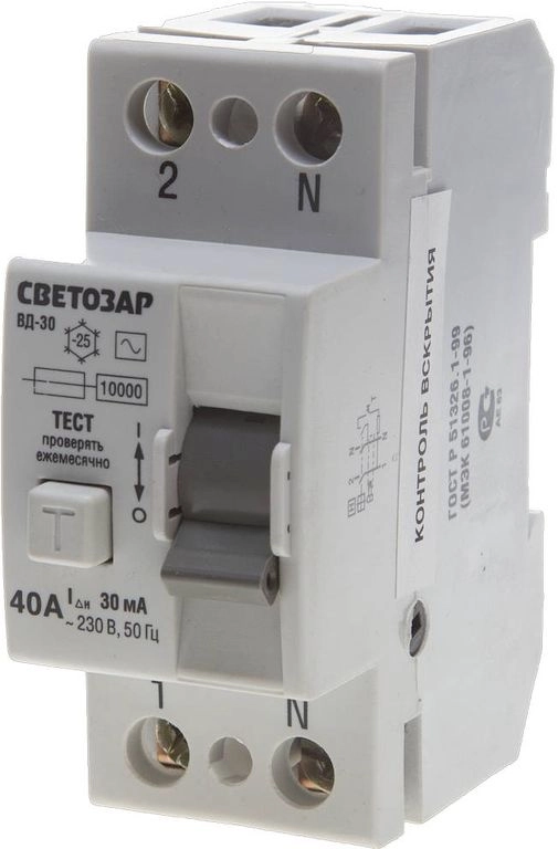ПроизводителиВыключатель дифференциальный "УЗО" СВЕТОЗАР, 2-полюсный, 40 A, "AC", откл.диф.ток. 30 мА, 230 В