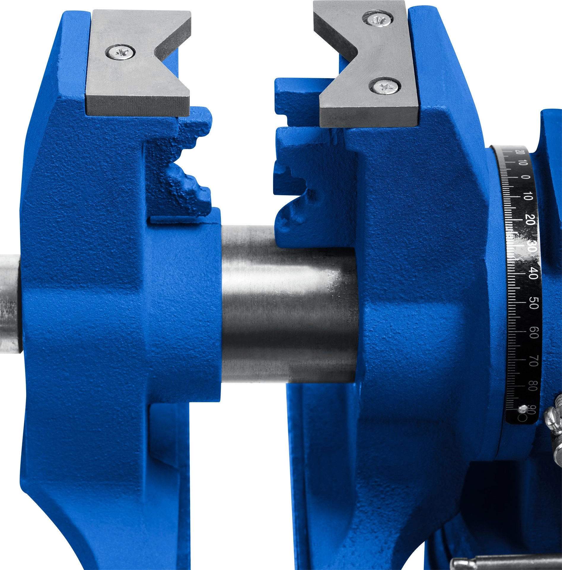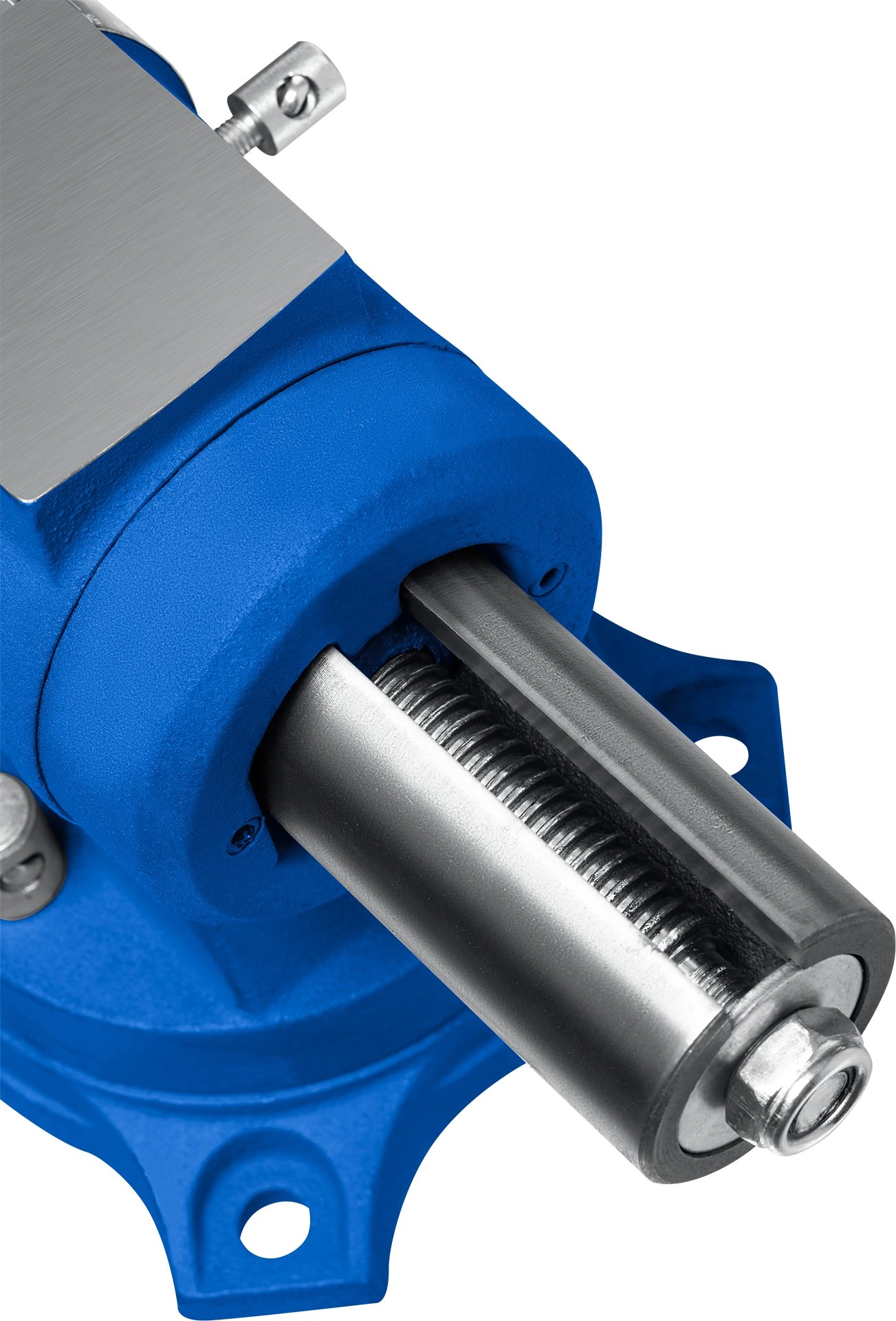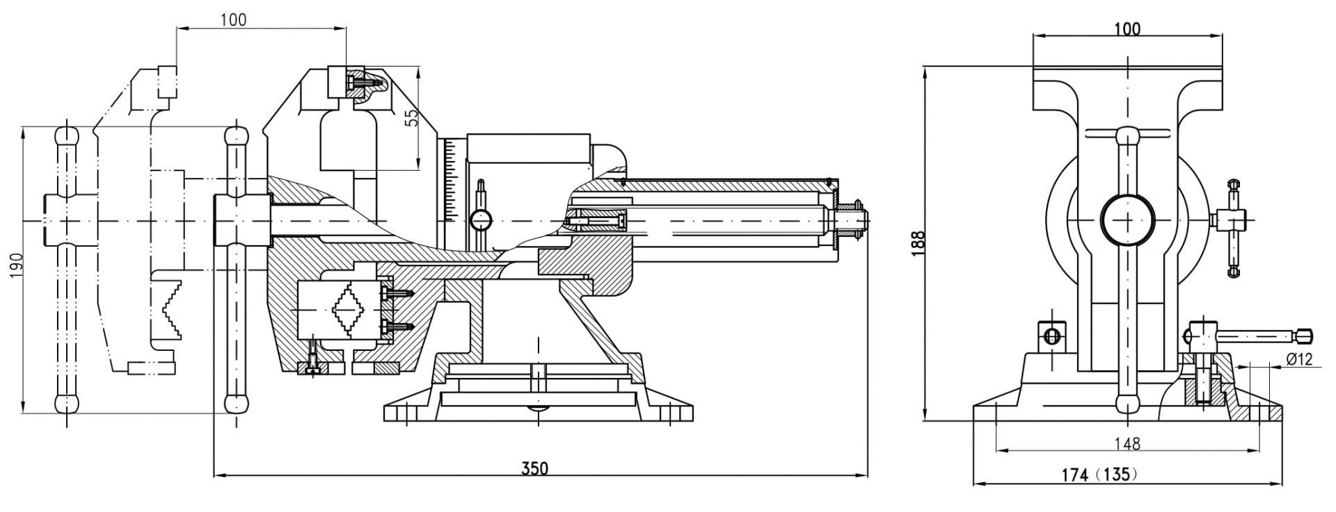 - Тиски слесарные с ручным приводом предназначены для закрепления деталей в том числе круглой формы при выполнении различного вида слесарных работ. - Корпус и подвижная планка изготовлены из высококачественного чугуна марки СЧ-25 по ГОСТ 26358. - Цилиндрическая форма и закрытый корпус тисков обеспечивают плавный ход подвижной планки и отсутствие люфта. - Сменные губки изготовлены из высококачественной инструментальной стали и закалены до твердости 45-53HRC и отшлифованы. - На рабочую поверхность губок нанесены рифления для надежного и безопасного крепления деталей. - Для закрепления труб и деталей круглой формы на корпусе тисков предусмотрены дополнительные губки. - Поворотное основание позволяет перемещать корпус тисков в горизонтальной плоскости на угол от 0 до 360 градусов. - Увеличенная наковальня на корпусе тисков для выполнения слесарных работ. - Установка тисков на столе осуществляется при помощи винтов и гаек для чего в основании предусмотрены отверстия.
