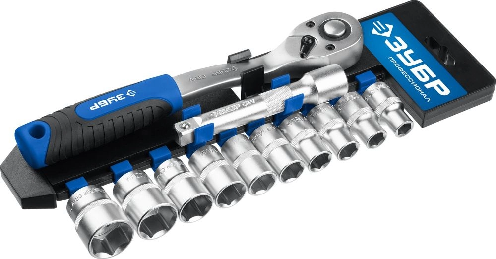 ПроизводителиНабор головок с трещоткой и удлинителем 1/2" 10-24мм, 12пр., на подвесе (27647-H12_z01) ЗУБР
