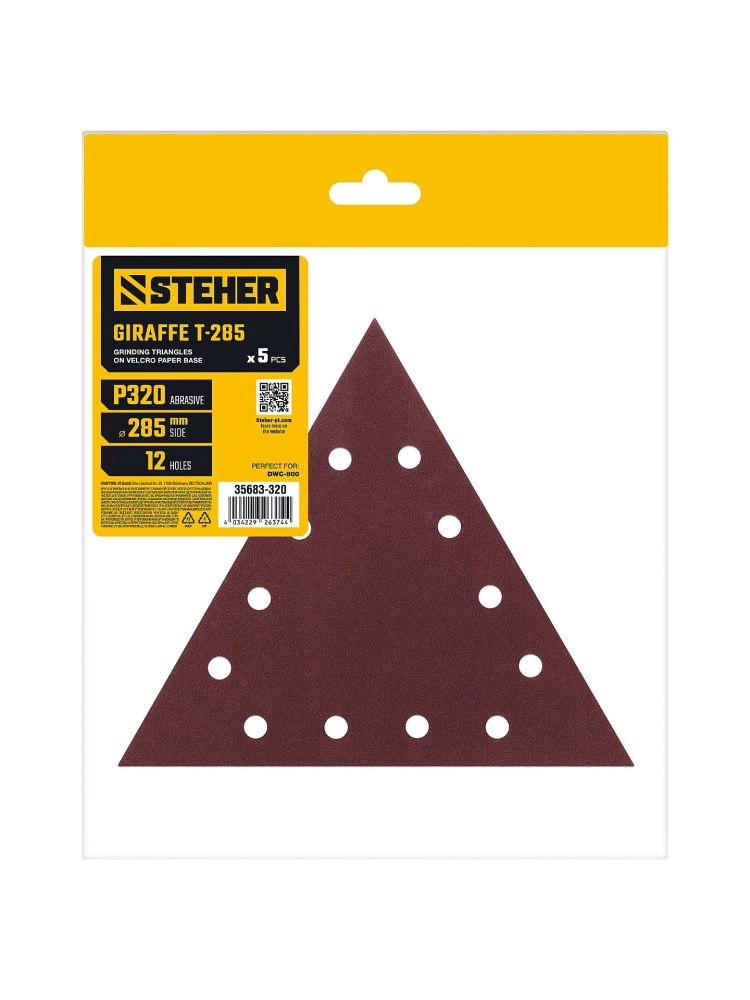 ПроизводителиТреугольник шлифовальный на липучке GIRAFFE T-285 мм, Р320, 12 отв., 5 шт. (35683-320) STEHER