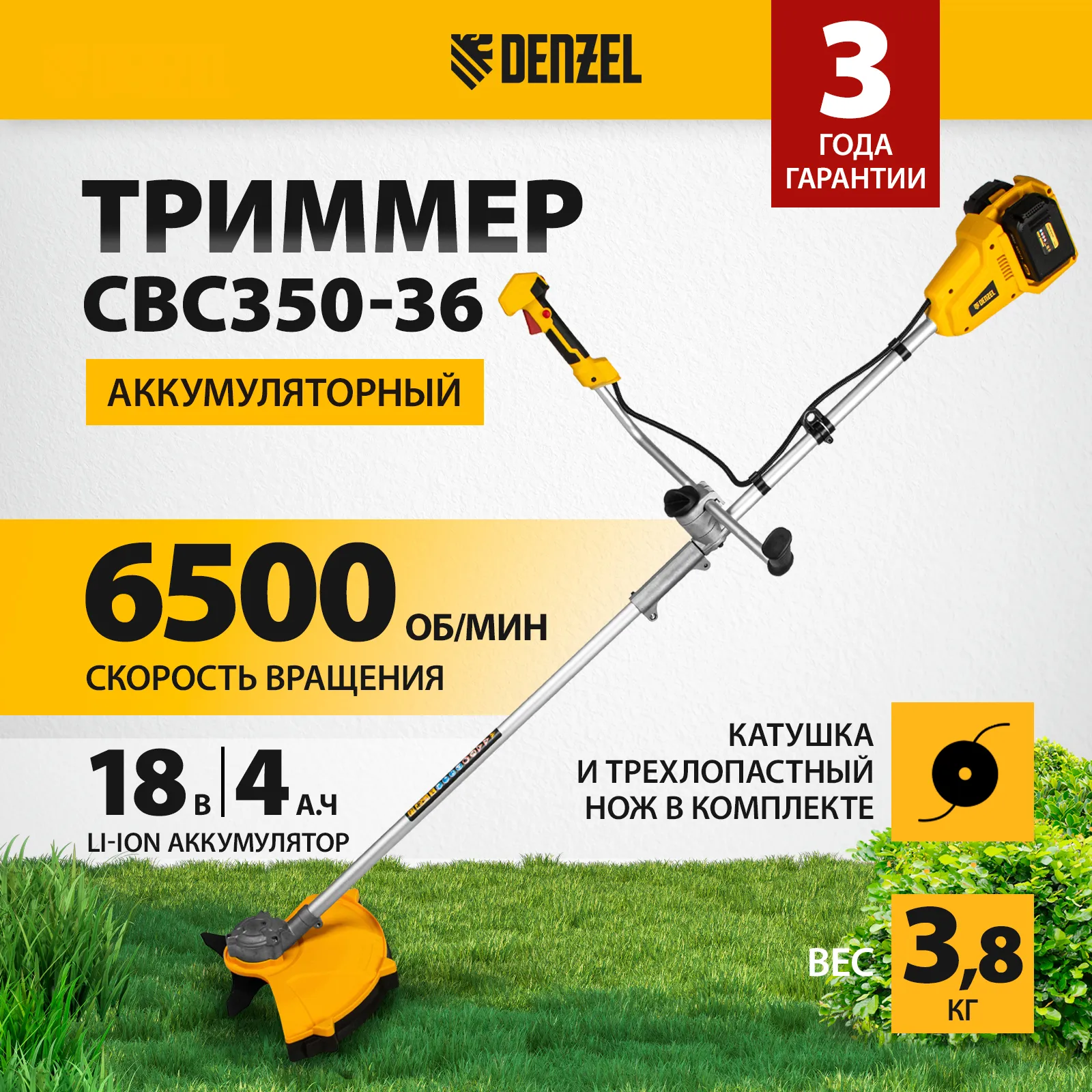 Аккумуляторный бесщеточный триммер Denzel CBC350-36 58720 с двумя батареями Li-ion, 36 В, используется для скашивания густой травы, сорняков и мелкого кустарника на приусадебном участке. В качестве оснастки используется катушка с леской диаметром 2 мм и трехлопастный нож. Ширина скашивания леской составляет 350 мм, ножом — 250 мм.