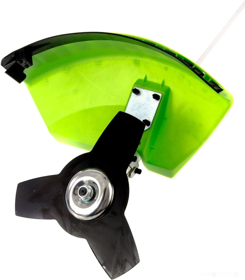 Для разного типа рельефа можно выбрать стальной трехлопастный нож или катушку с леской, ширина скашивания составит 25,5 см и 42 см соответственно.