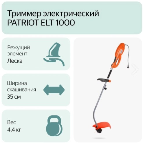 СТАНДАРТУровень качества. При классификации продуктов, имеющих схожее наименование, но обладающие различными потребительскими свойствами мы приняли следующий Вес факторов: 80% - подтвержденный ресурс, 15% - заявленная производительность/скорость, 5% - субъективные ощущения потребителя. ПодробнееКод товара: 0062664(0)ХарактеристикиАртикул 250304430Бренды PATRIOTСтрана производства КитайГарантия 24 месяцевГабариты (ШхВхГ),мм 260х890х120Тип электрическийПотребляемая мощность 950Мощность, л.с. 1.3Частота вращения вала 7500Ширина скашивания 35Высота травы после стрижки, мм (мин-макс) 35Цвет оранжевый, черныйДвигатель/Тактность электрическийРежущий элемент ЛескаТип ручки D-образнаяНапряжение 220Толщина лески, мм 2,0-2,4Колеса 3275Тип штанги разборнаяФорма штанги изогнутая разъемнаяТип ремня плечевойРасположение двигателя верхнееВес 4.4Мощность двигателя 1.3Режущая оснастка лескаДиаметр лески 2.4Сменные насадки нетШирина скашивания леской 35Уровень шума 96Регулировка угла наклона нетТип штанги изогнутая/неразъемнаяШирина в упаковке 26.5Высота в упаковке 12Глубина в упаковке 88Описание товара обновлено 08.12.2025 15:06:49Ручка с элементами управленияи выполнена с учетом всех законов эргономики;