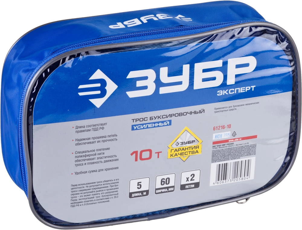 ПроизводителиТрос буксировочный "ЭКСПЕРТ", 2 петли, сумка, 5м, 10т (61216-10) ЗУБР
