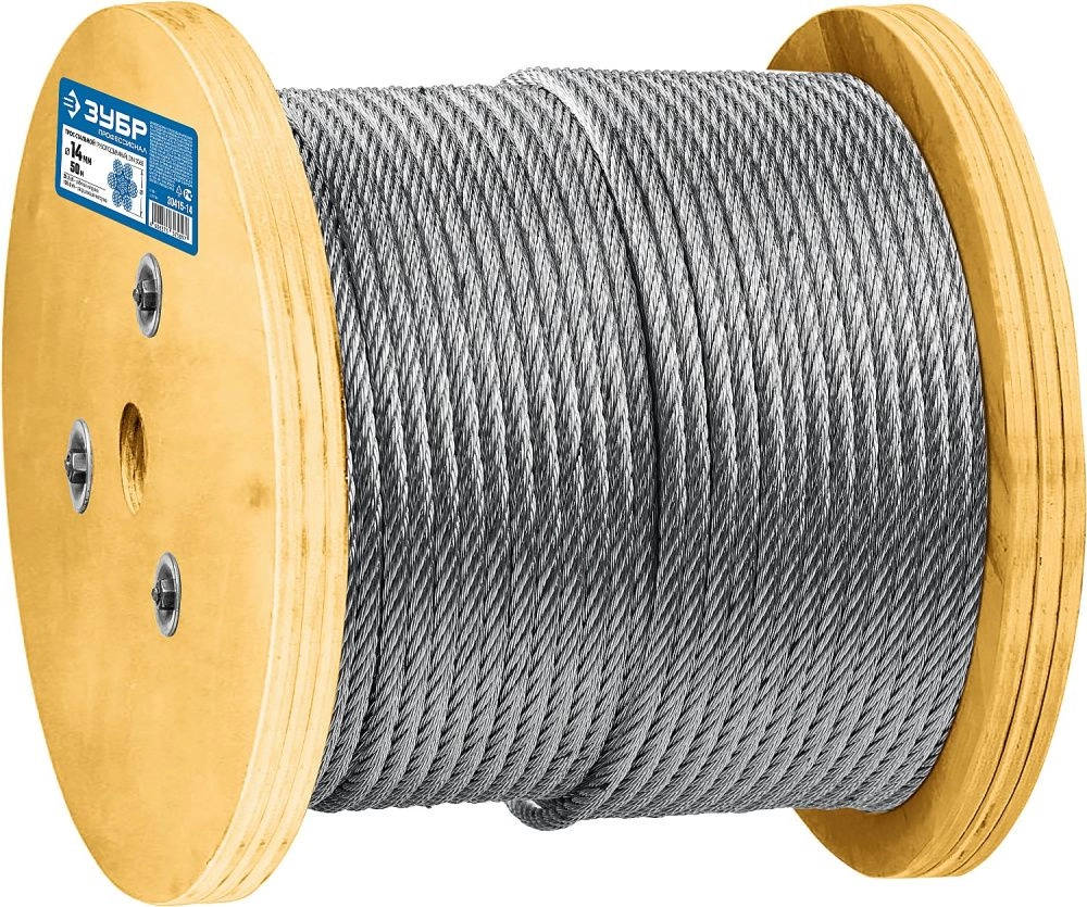 ПроизводителиТрос грузоподъемный стальной, оцинк., DIN 3060, d=14 мм, L=50м, свивка 6 х 19 + IWR (30415-14) ЗУБР