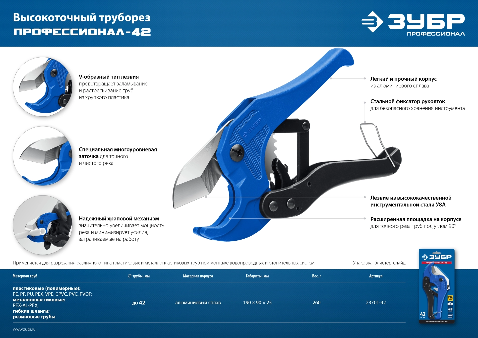 Бренд: ЗУБРПрофессиональный инструмент облегченной конструкции и наилучшего качества реза пластиковых труб