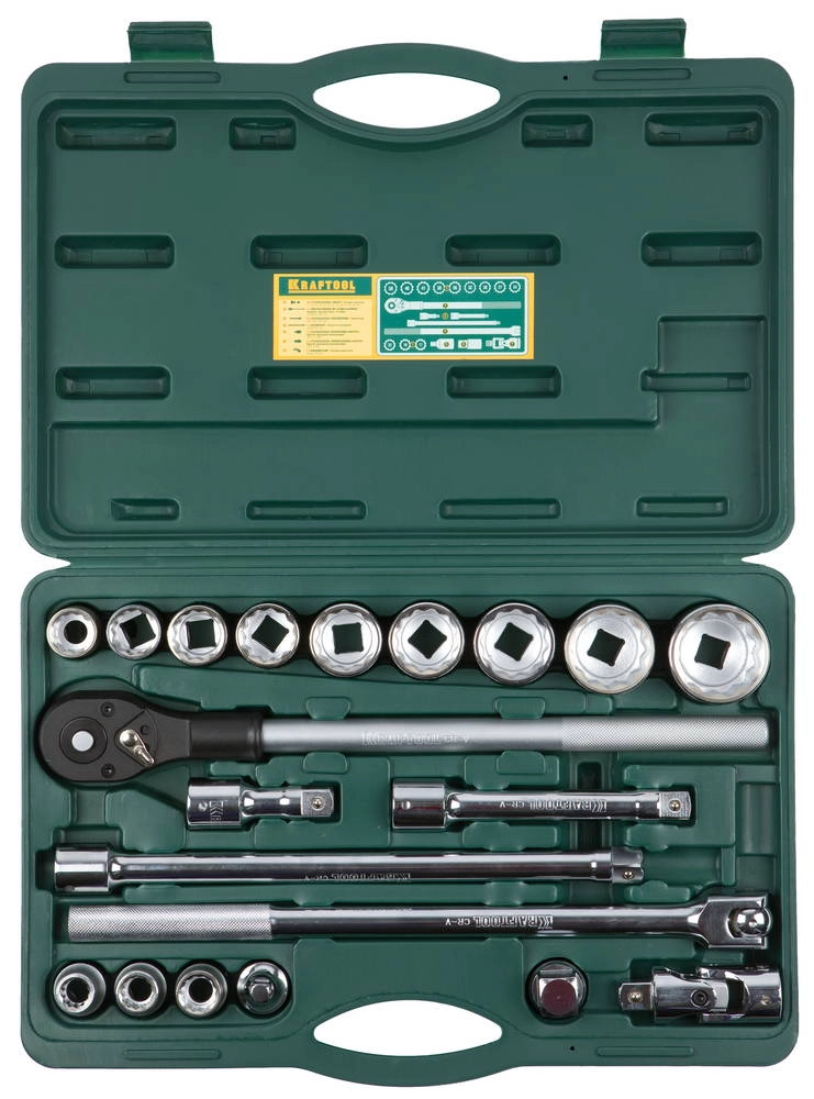 ПроизводителиНабор головок с трещоткой и удлинителями 3/4", 17-50мм, 20 пр., пласт. чем. (27895-H20_z01) KRAFTOOL