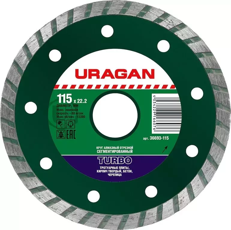 ПроизводителиTURBO 115 мм, диск алмазный отрезной сегментированный по бетону, кирпичу, камню, (36693-115) URAGAN