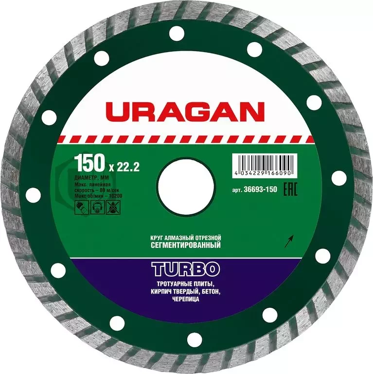 ПроизводителиTURBO 150 мм, диск алмазный отрезной сегментированный по бетону, кирпичу, камню, (36693-150) URAGAN