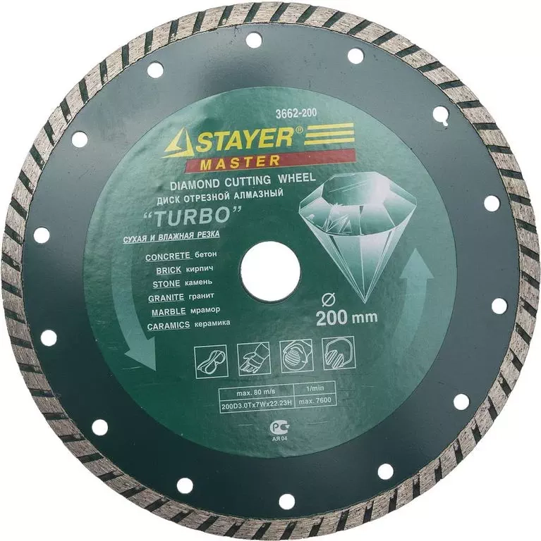 ПроизводителиTURBO 200 мм, диск алмазный отрезной сегментированный по бетону, кирпичу, плитке, (3662-200) STAYER