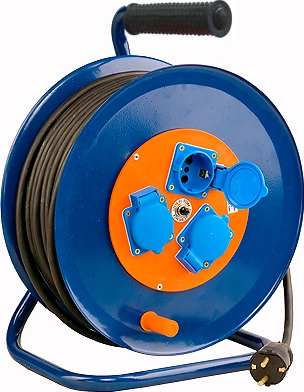 - Удлинитель на металлической катушке 50 м , имеет три брызгозащищенные розетки со степенью защиты IP 44 и кабель КГ 3х1,5 мм. Имеет автомат защиты по току на 16 А.
