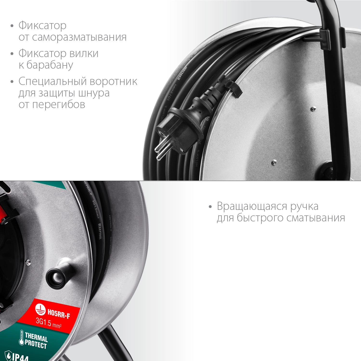 - Катушка позволяет легко сматывать и разматывать кабель, обеспечивая мобильное перемещение и компактное хранение.