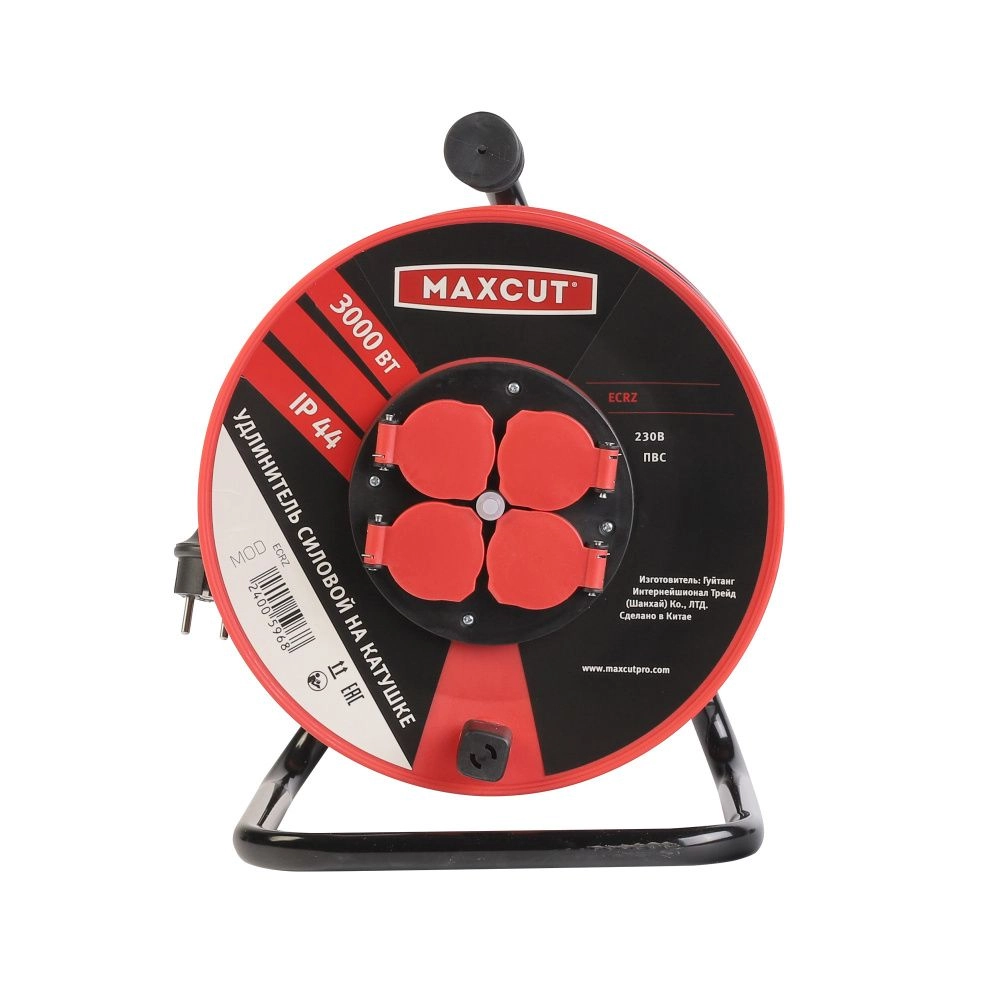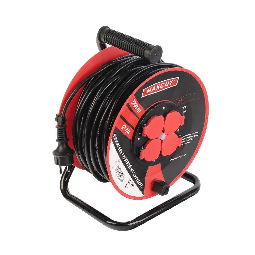 ПроизводителиУдлинитель на катушке 30м (ПВС 3х1.5мм2, 3.0кВт/16А, IP44, 4 р. с/з, 220В, пласт.кат) MAXCUT
