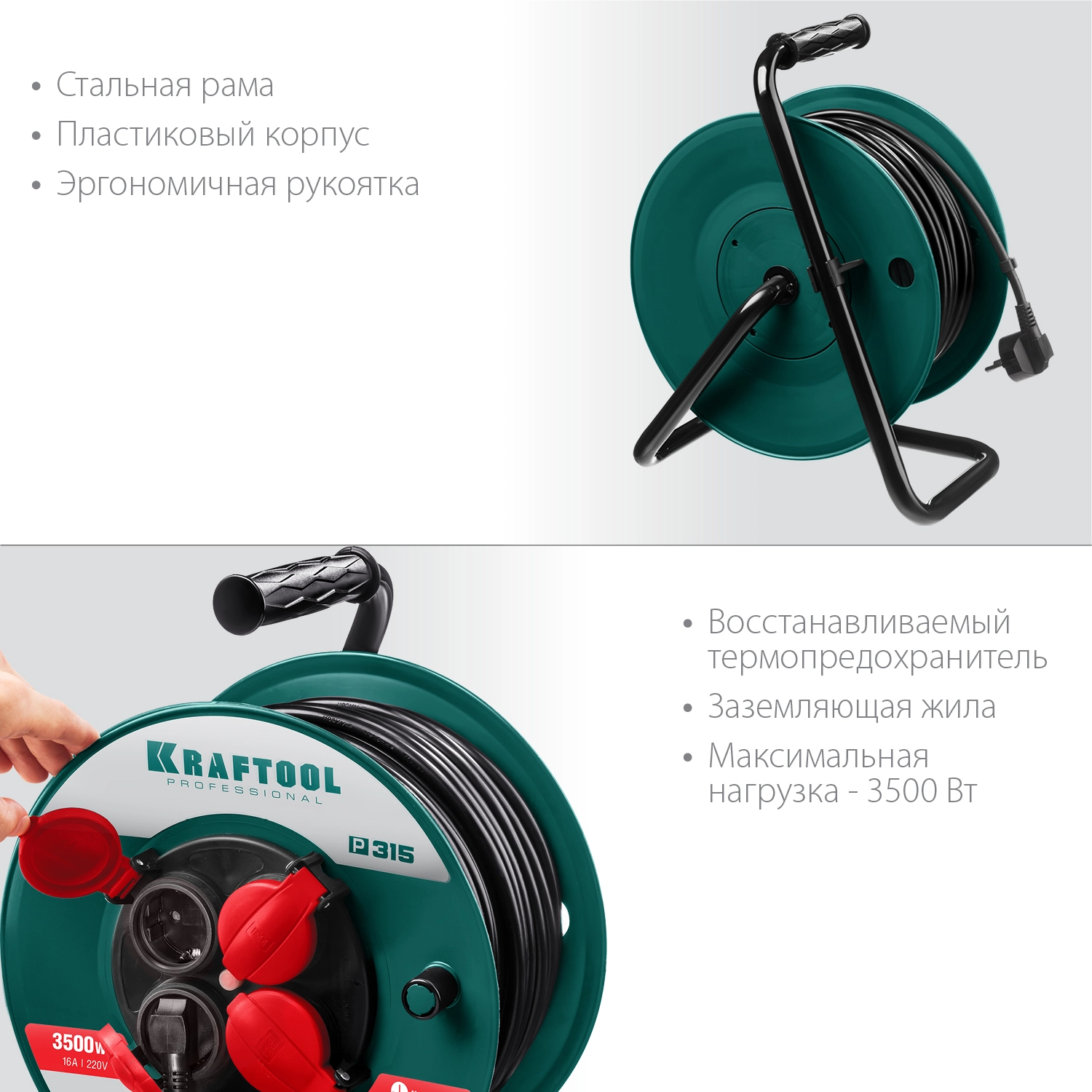 ПроизводителиУдлинитель на катушке 50м (ПВС 3х1.5мм2, 3.5кВт, IP44, 4 р., 220В, пласт. кат.)(55084-50) KRAFTOOL
