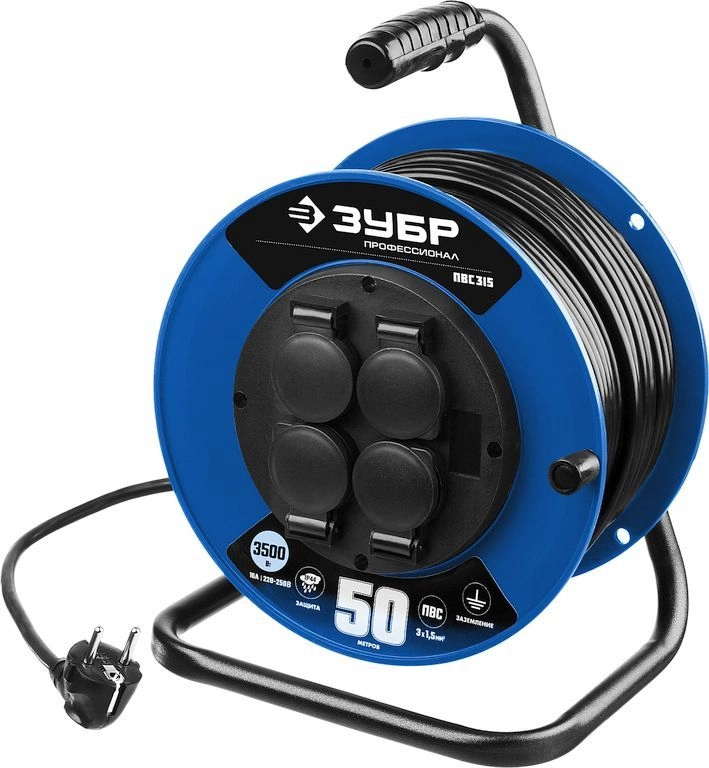 ПроизводителиУдлинитель на катушке 50м (ПВС 3х1,5мм2, 3,5кВт/16А, IP44, 4 р., 220В, пласт. кат) (55081-50) ЗУБР